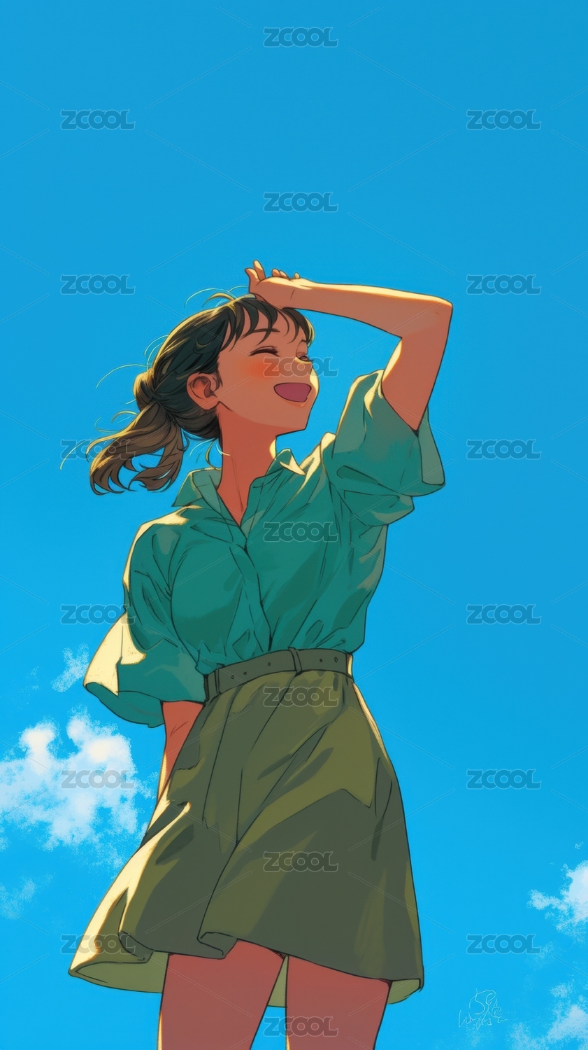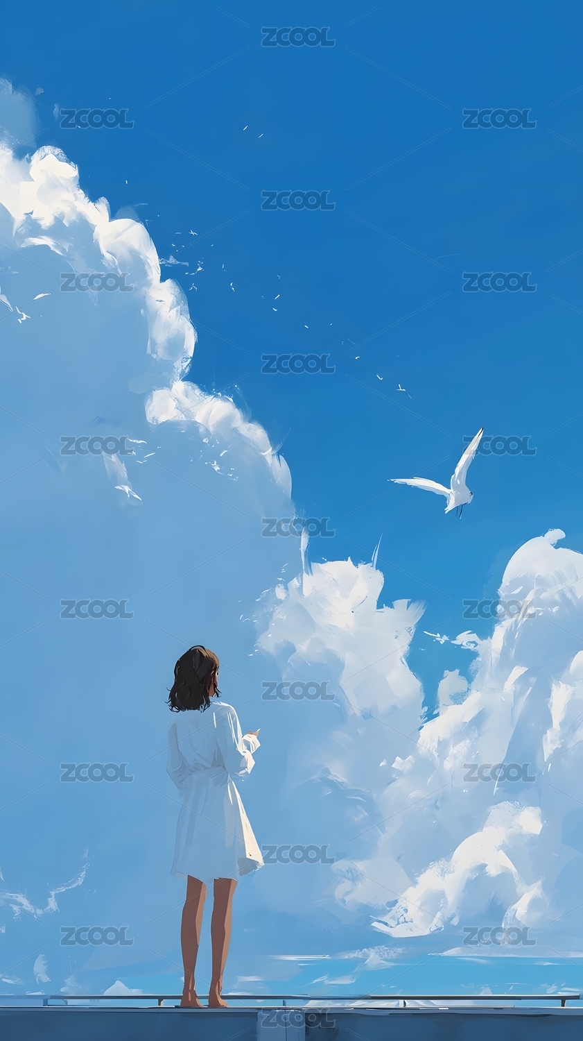 天空下的女孩卡通插画