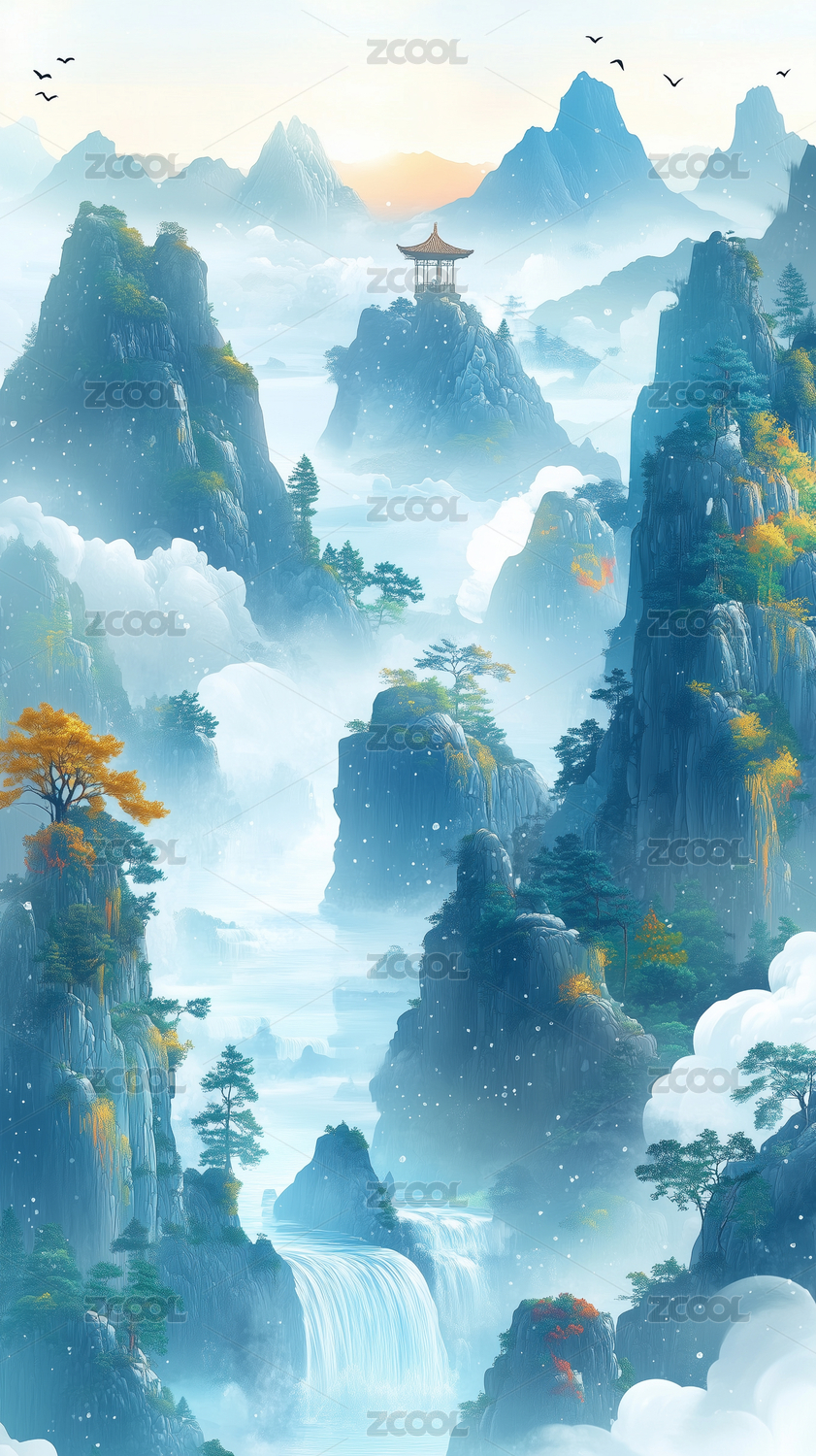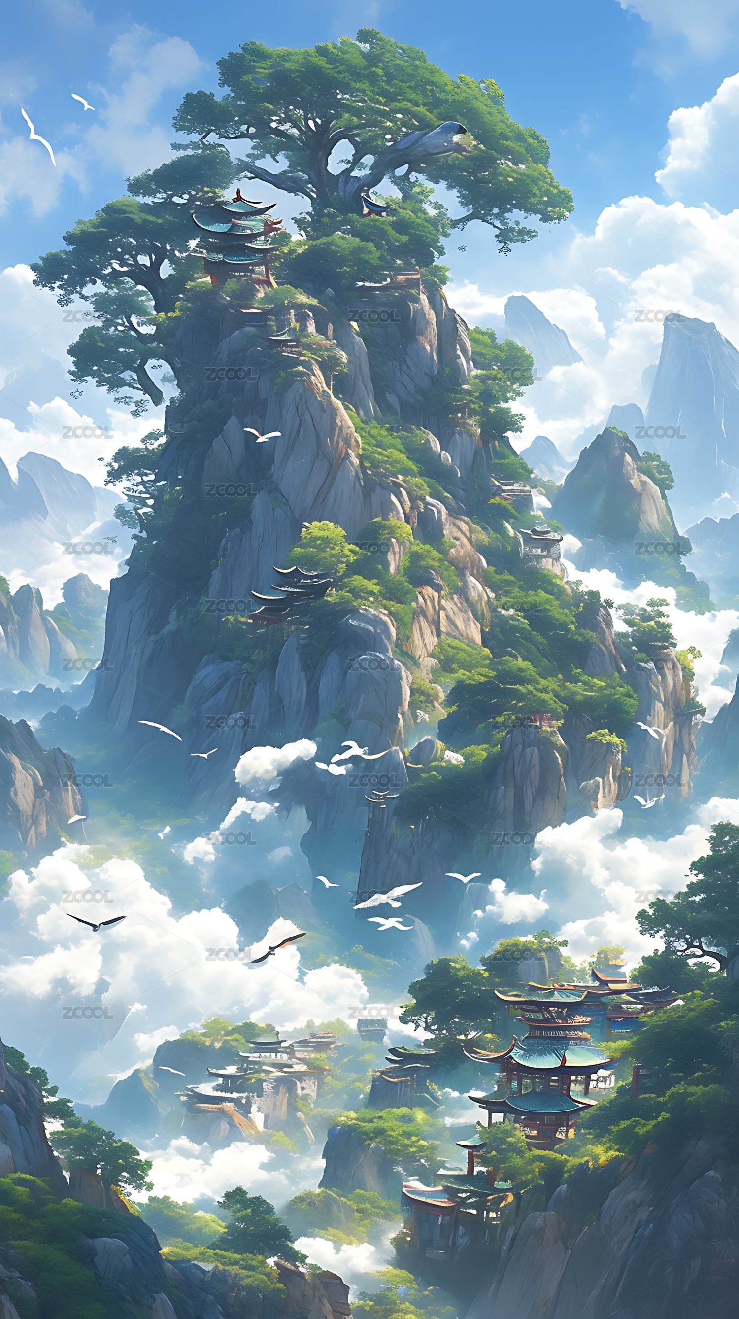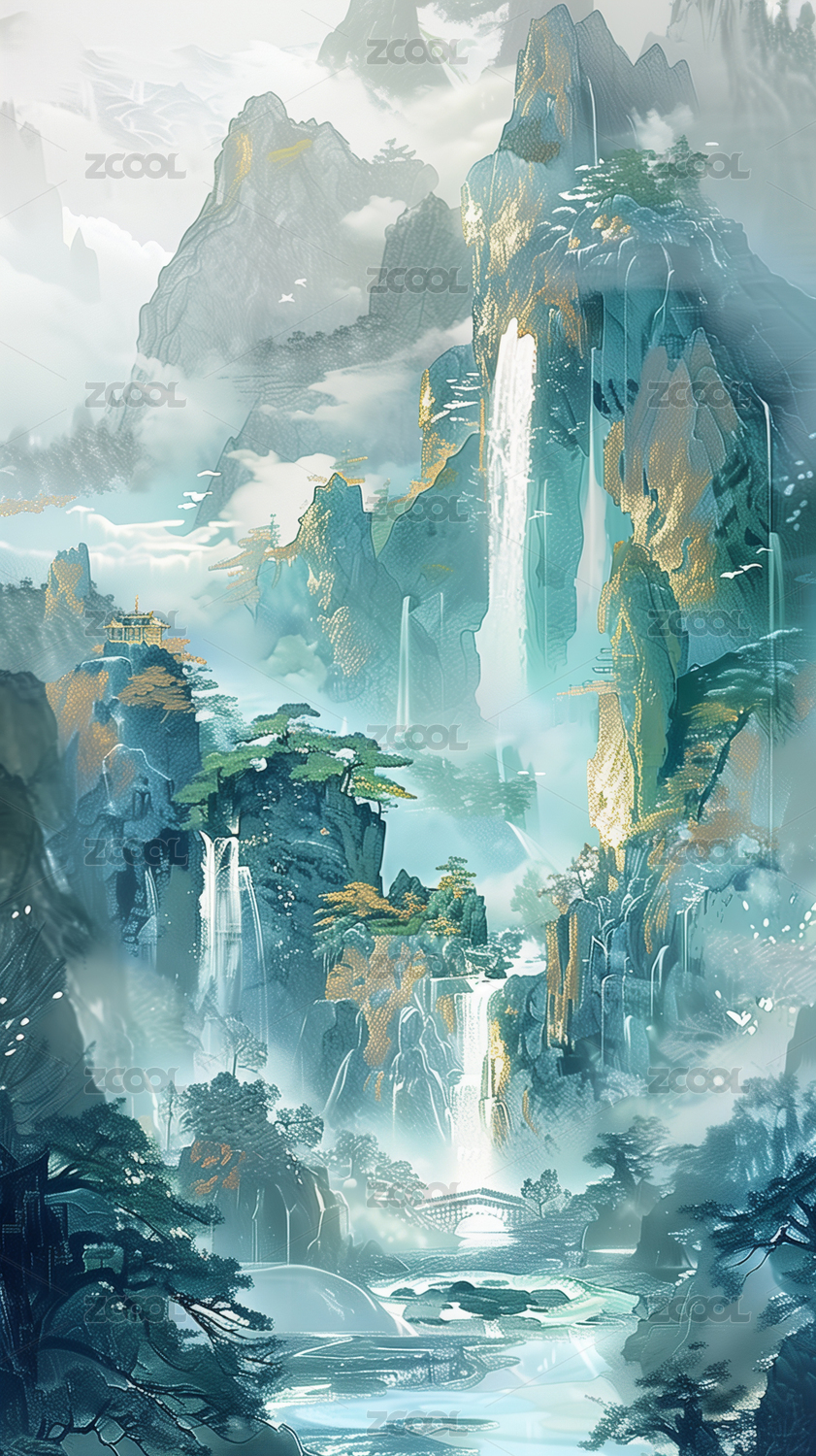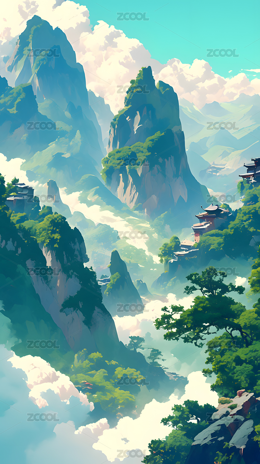 有亭台楼阁小桥流水的仙境绿色山水3D卡通