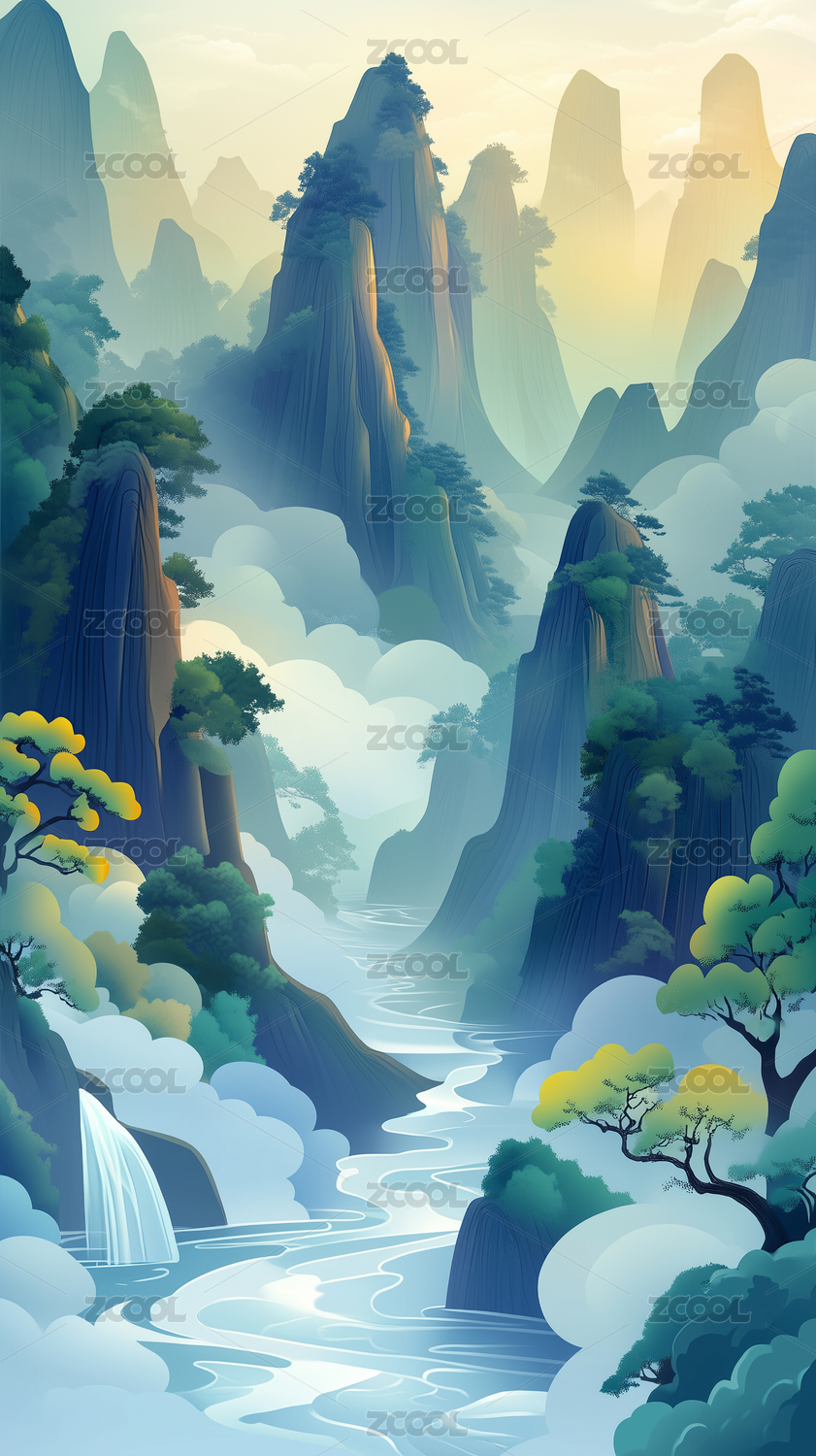 中国风,山水,风景,山,河流,湖泊,卡通,插画