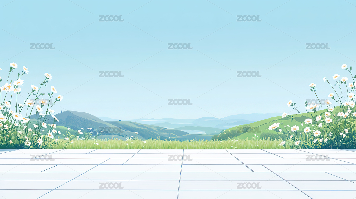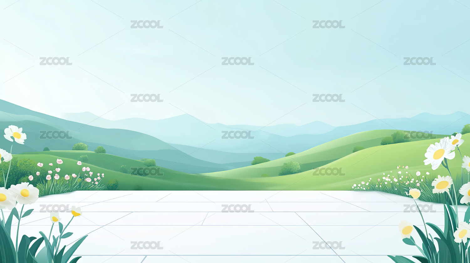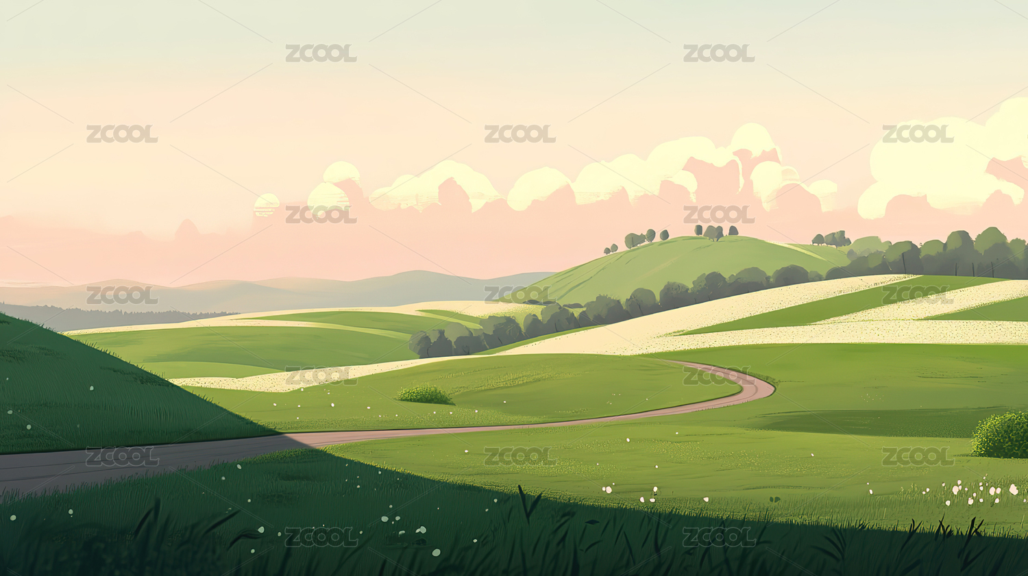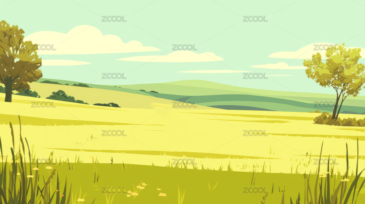 唯美清新草原蓝天白云春天夏天季节风景插画