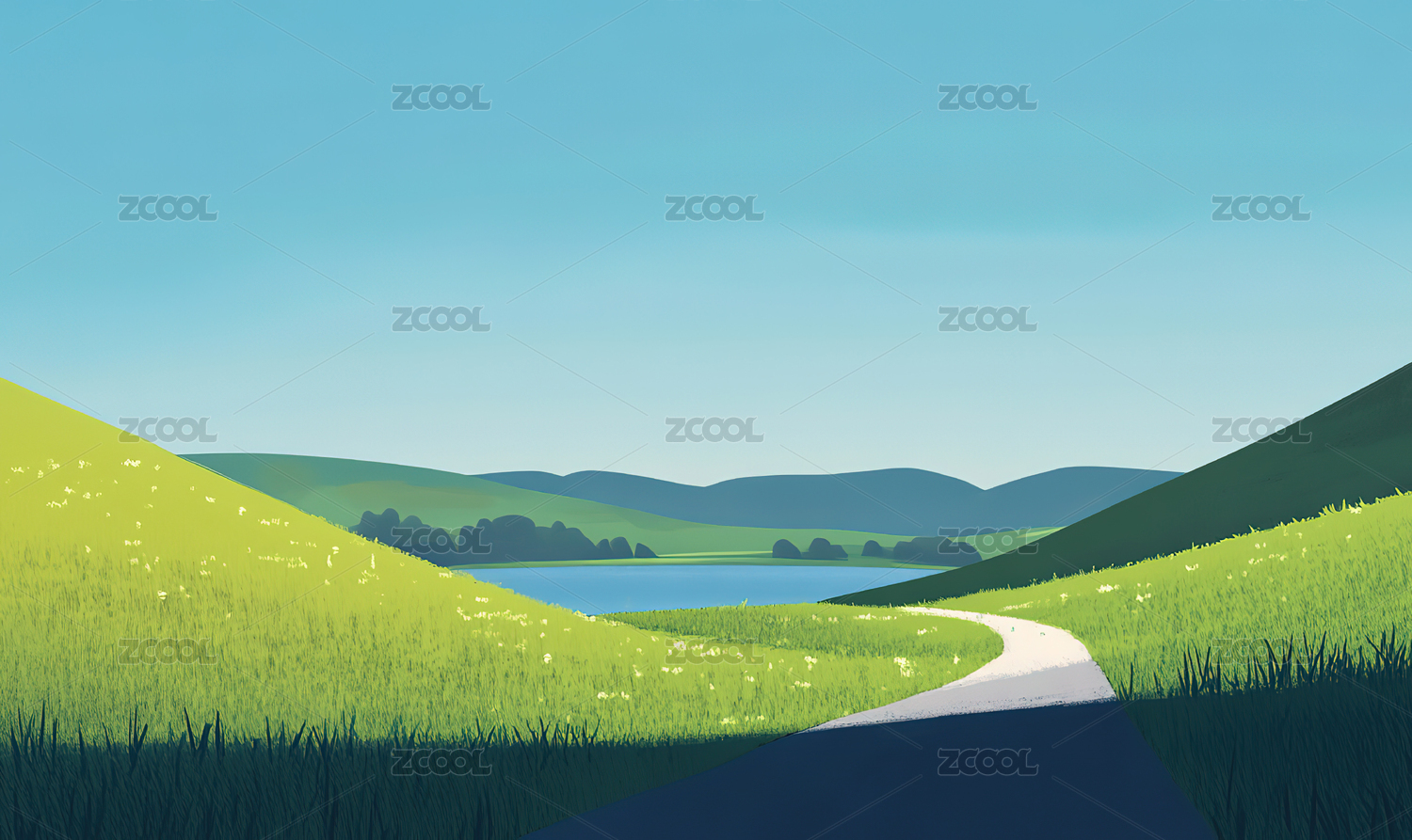 蓝天白云绿色草地湖泊卡通动漫背景插画壁纸