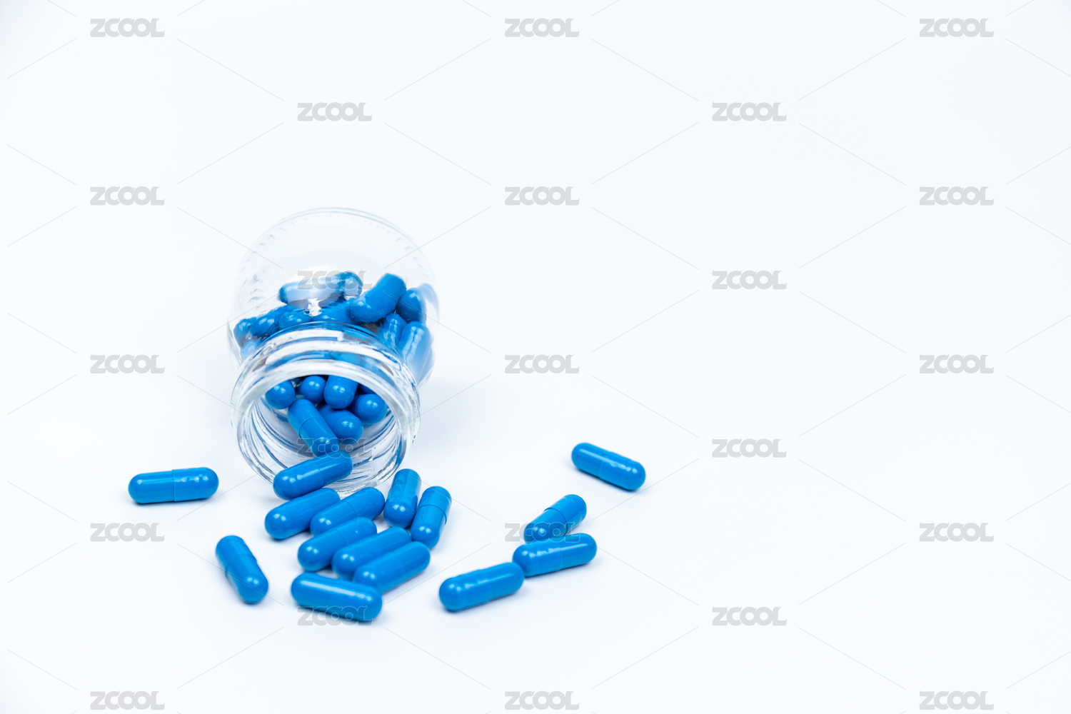 白色背景纸上放着蓝白色胶囊和白色药瓶。