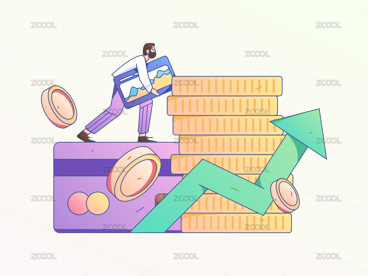 卡通手绘男人手持金币财富赚钱网络经济上涨插画