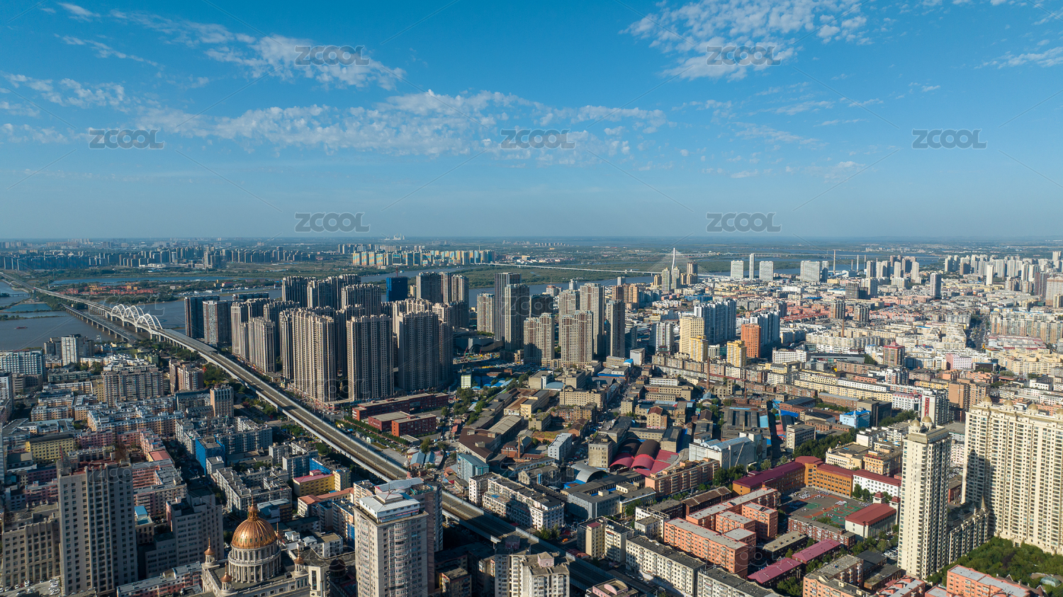 中国黑龙江省哈尔滨市中心航拍城市天际线
