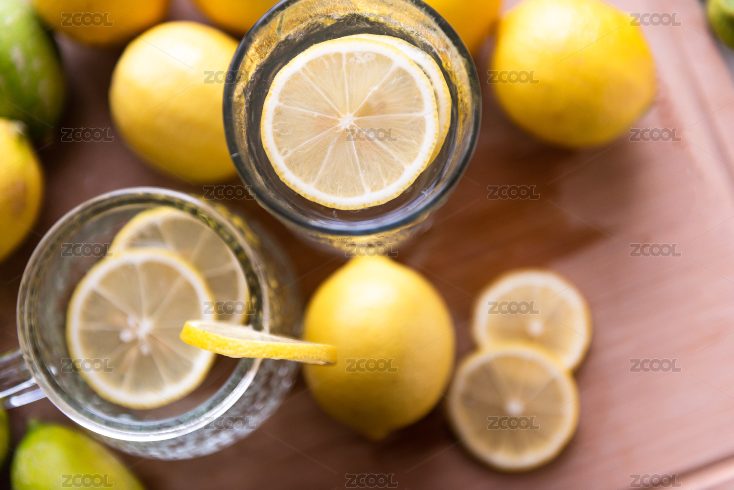 俯视桌子上一杯柠檬水和鲜柠檬果