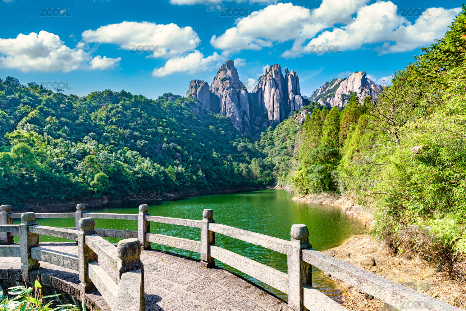 太姥山的奇石山峰及山脚的湖面和石拱桥