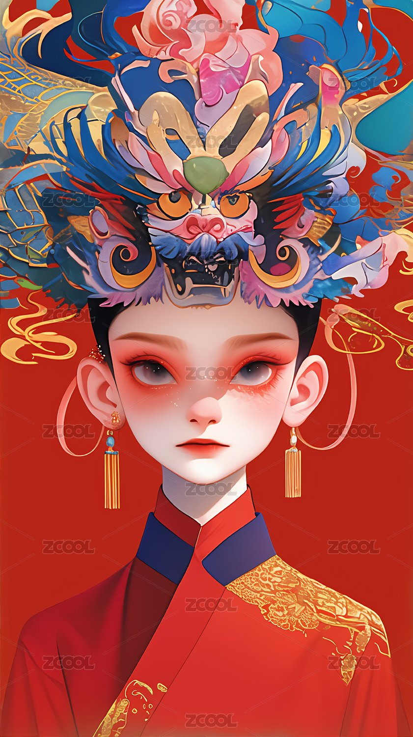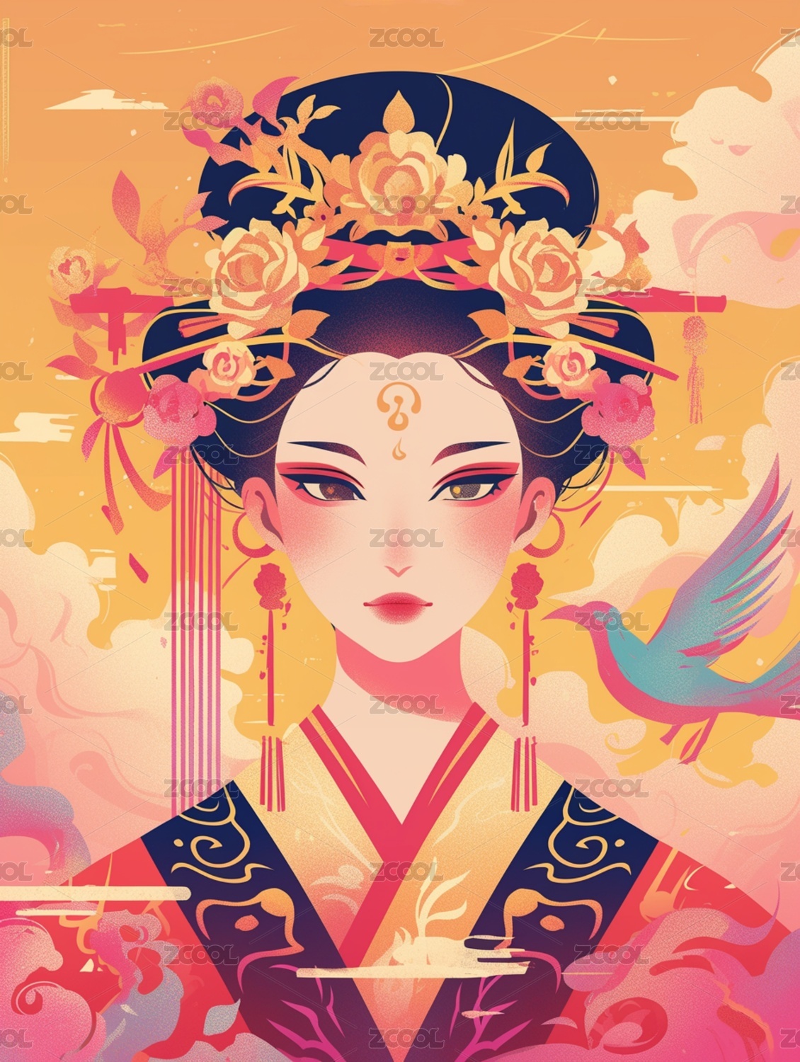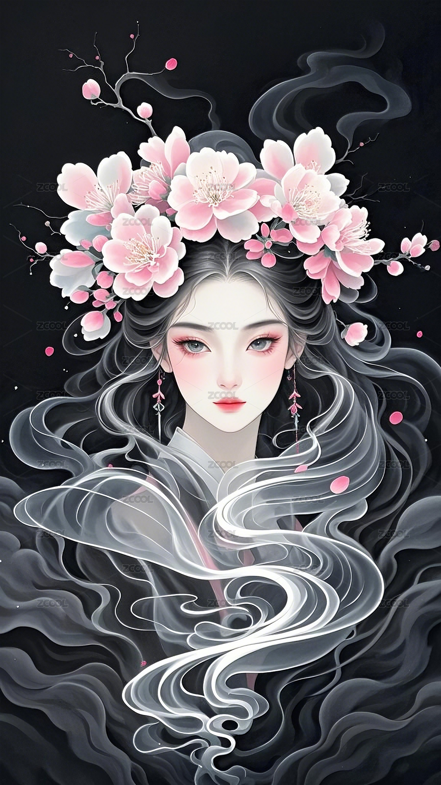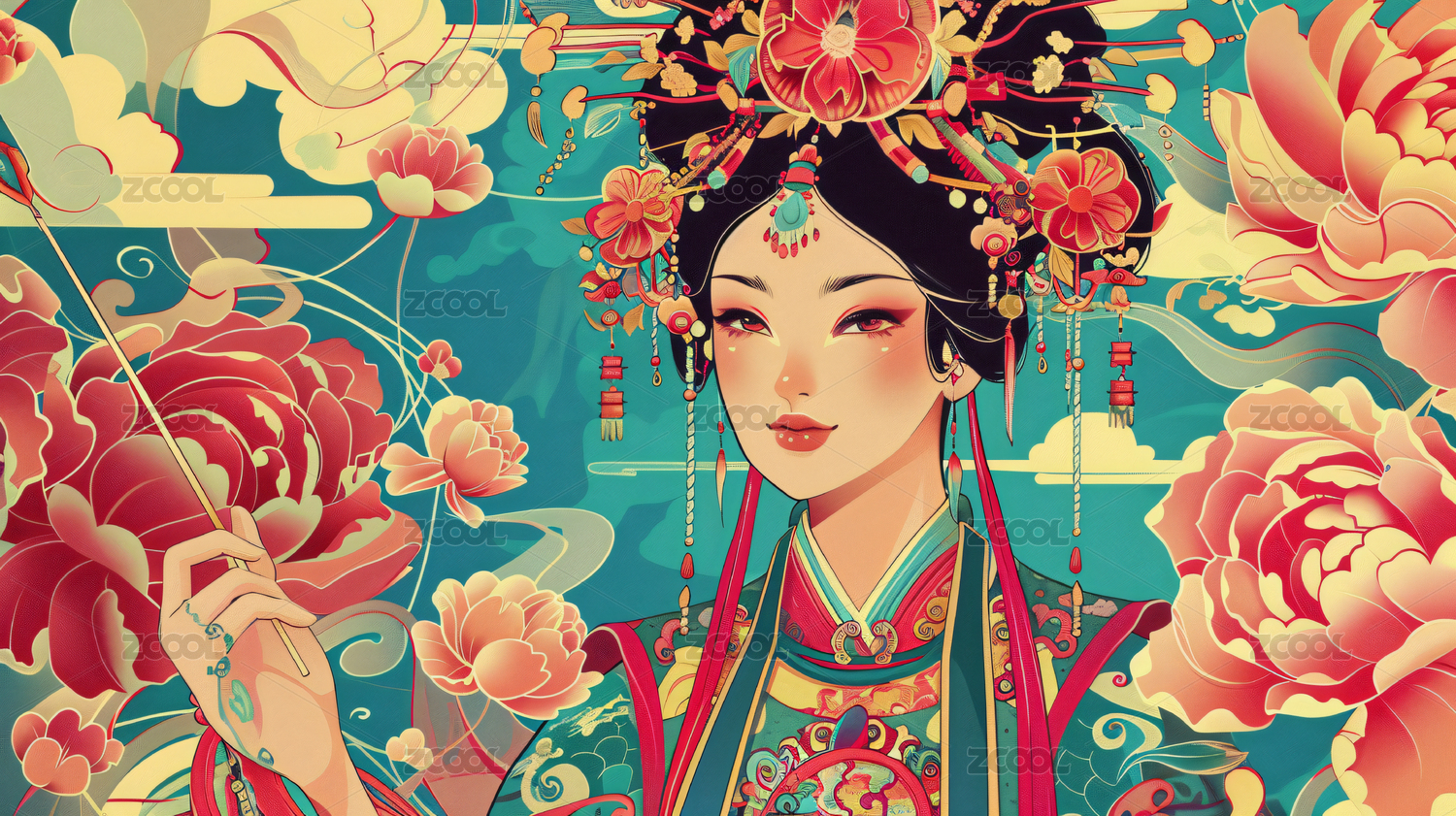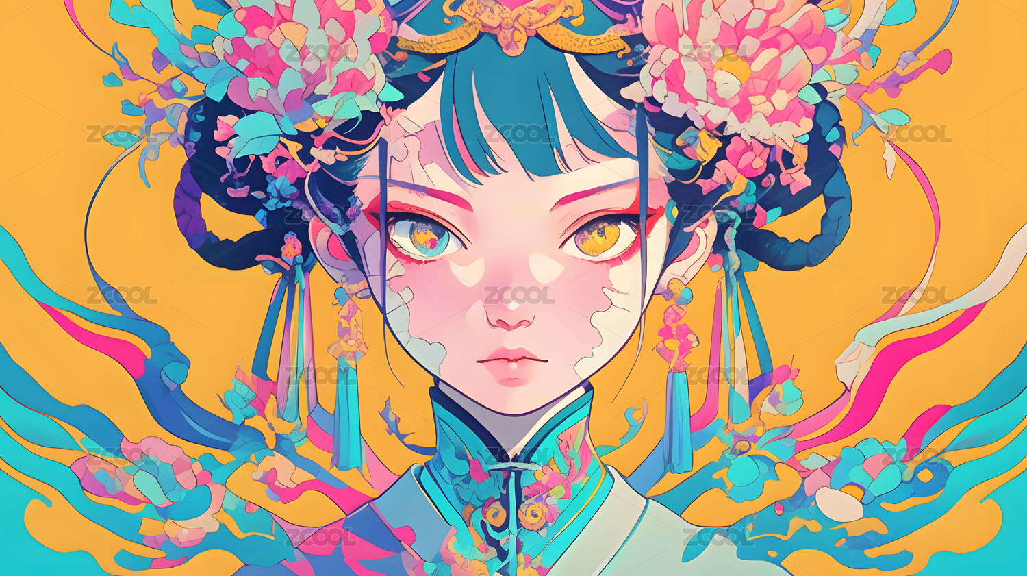 国潮,插画,中国风,戏剧,粉色,国风,美女,桃花,装饰,艺术