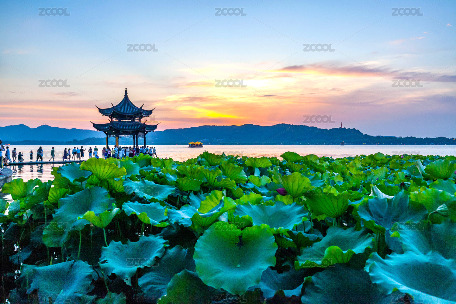 中国浙江杭州西湖,长桥公园双投桥夕影亭与雷峰塔