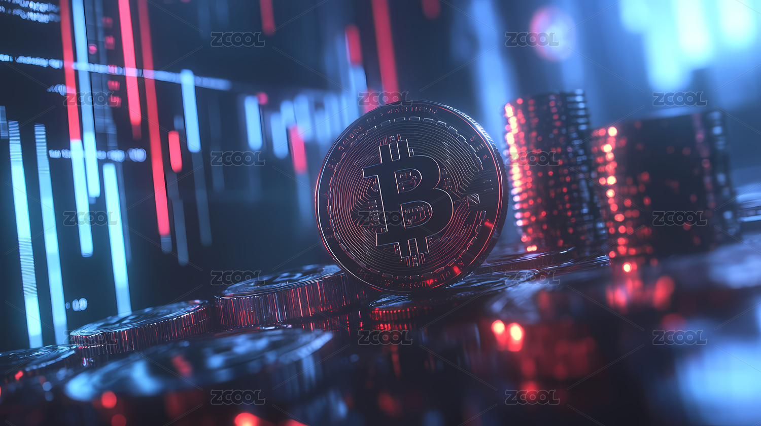 金色比特币红蓝图表背景