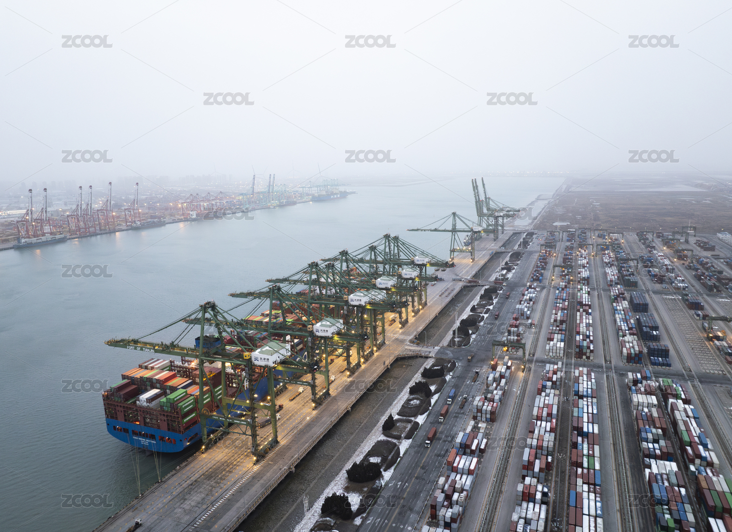 雪后天津港的夜景