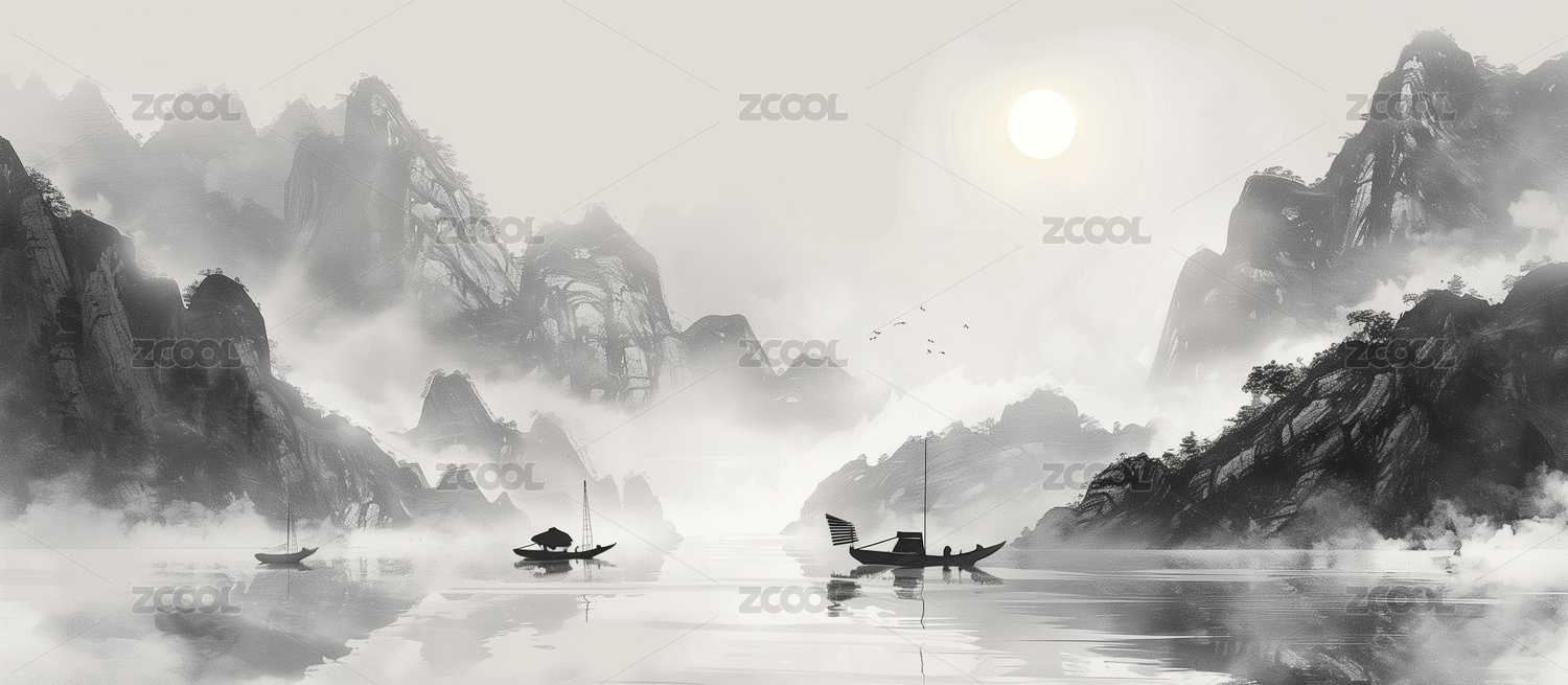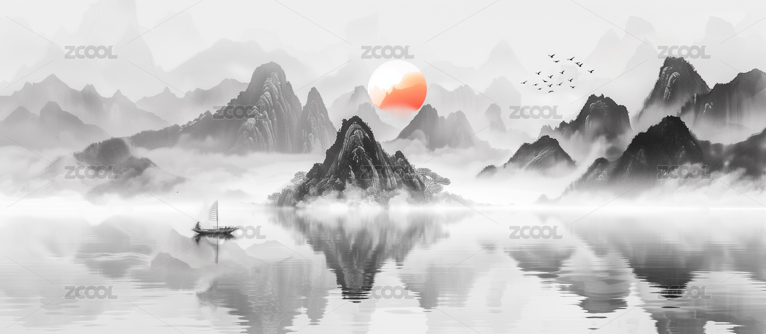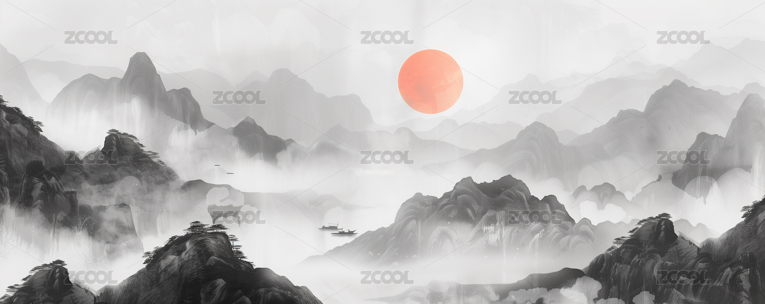 大气意境日出日落风光山水画水墨画