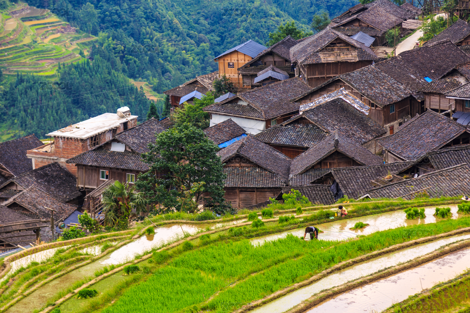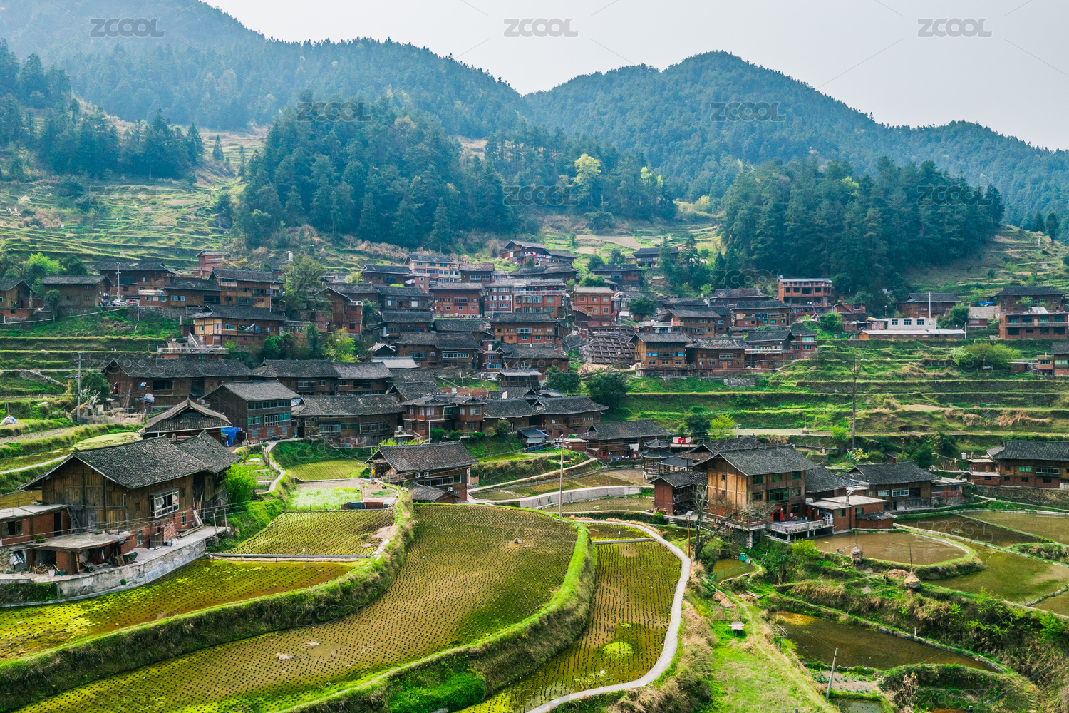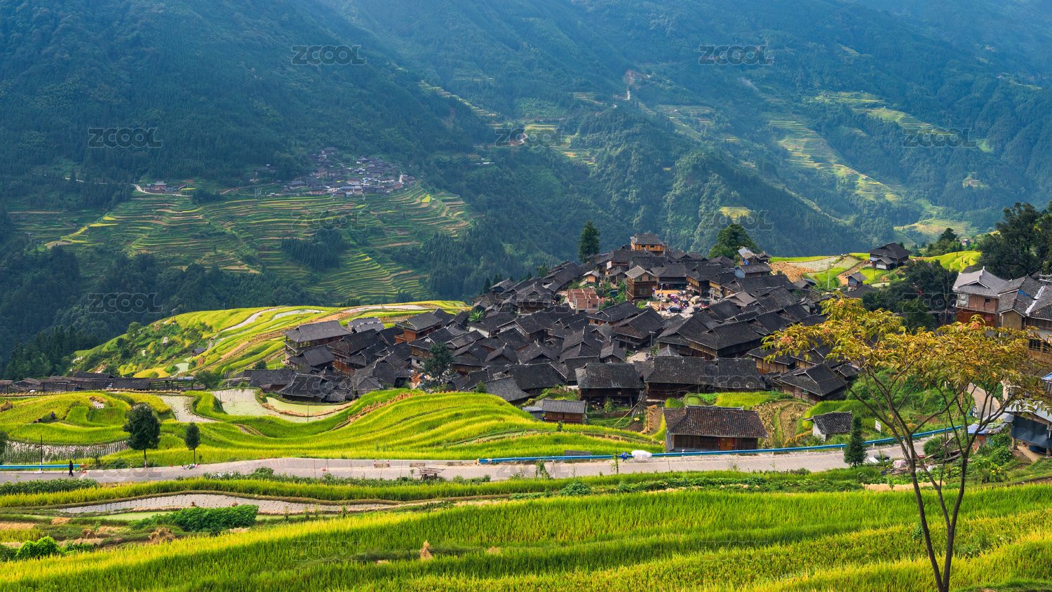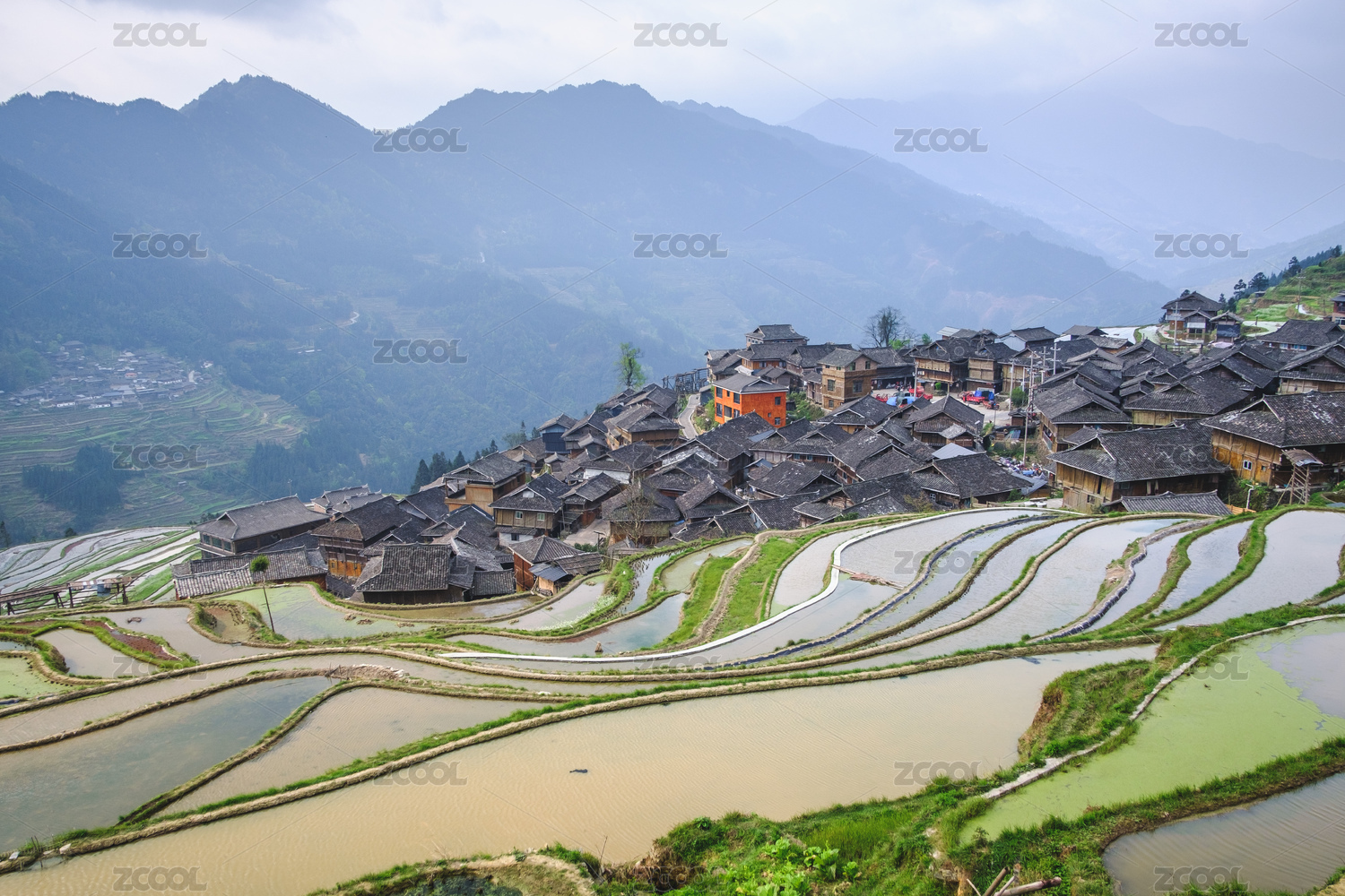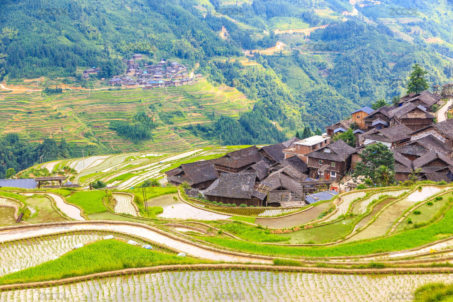 中国贵州省从江县加榜梯田风光,梯田环绕的村寨