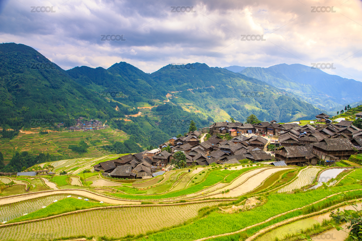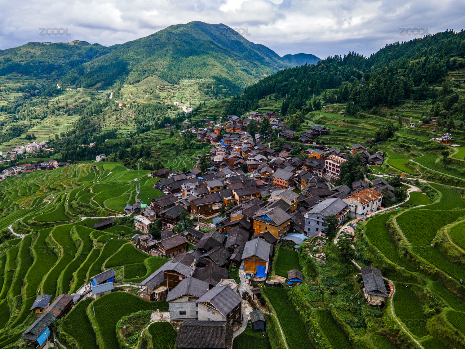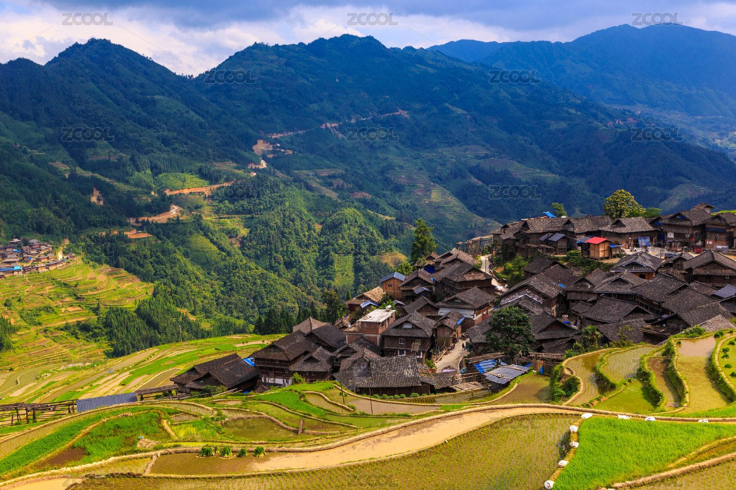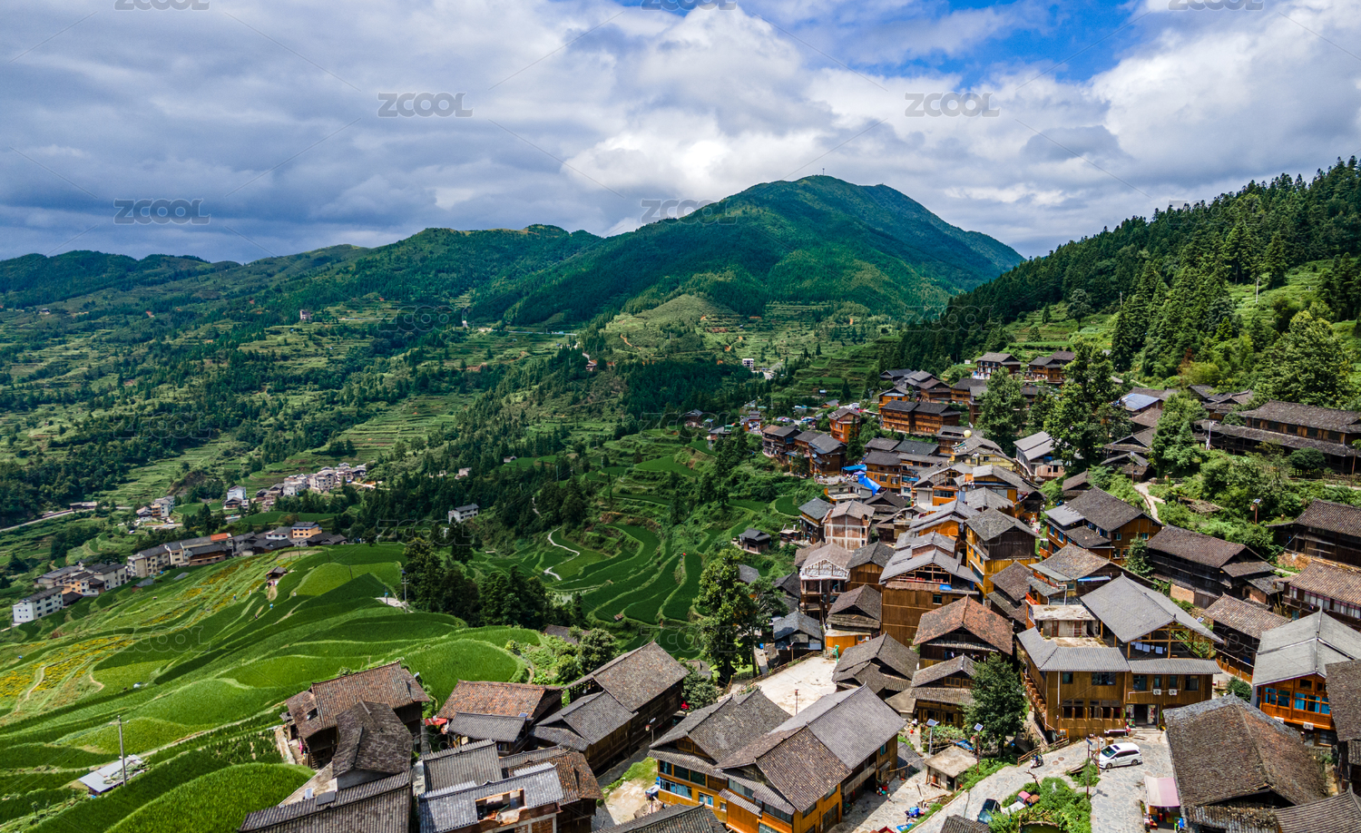 中国贵州省从江县加榜梯田风光,梯田环绕的村寨