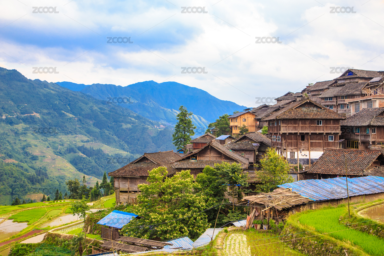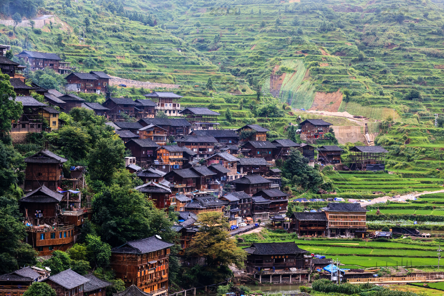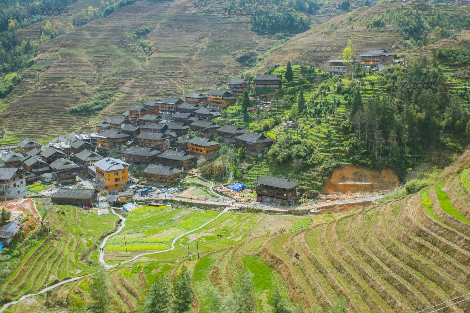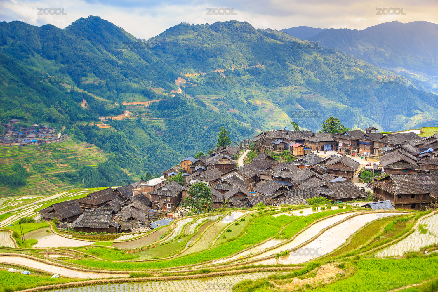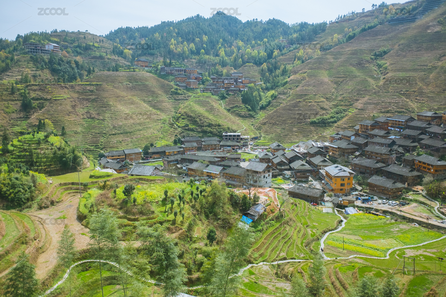 中国贵州省从江县加榜梯田风光,梯田环绕的村寨
