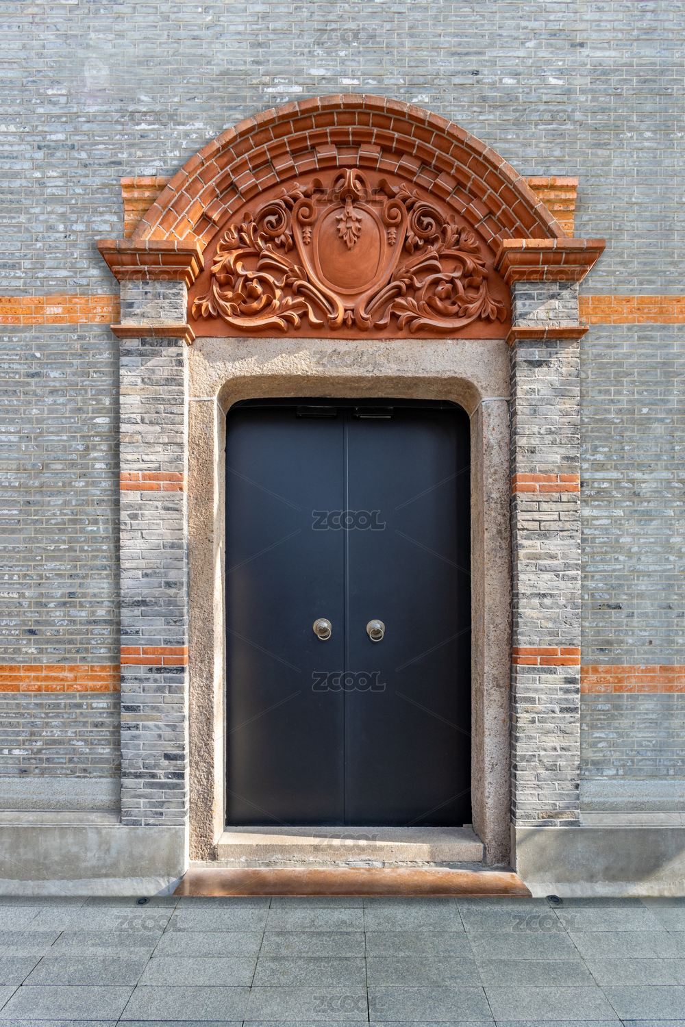 上海石库门新天地老建筑拱形雕花石门特写