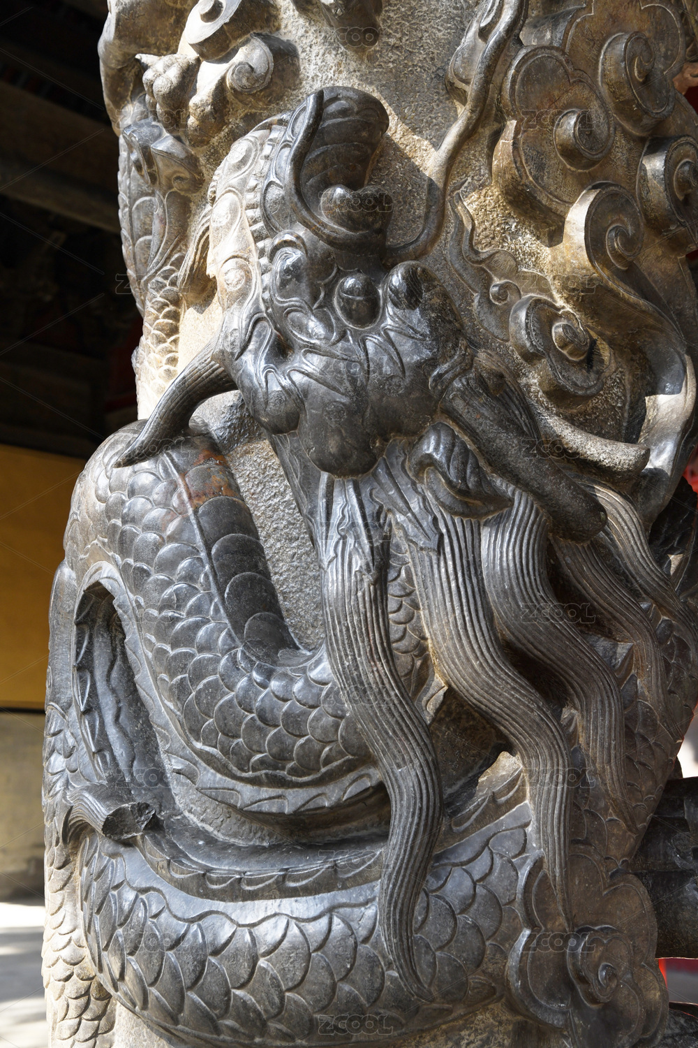 中式古典建筑龙柱上的金色祥云浮雕