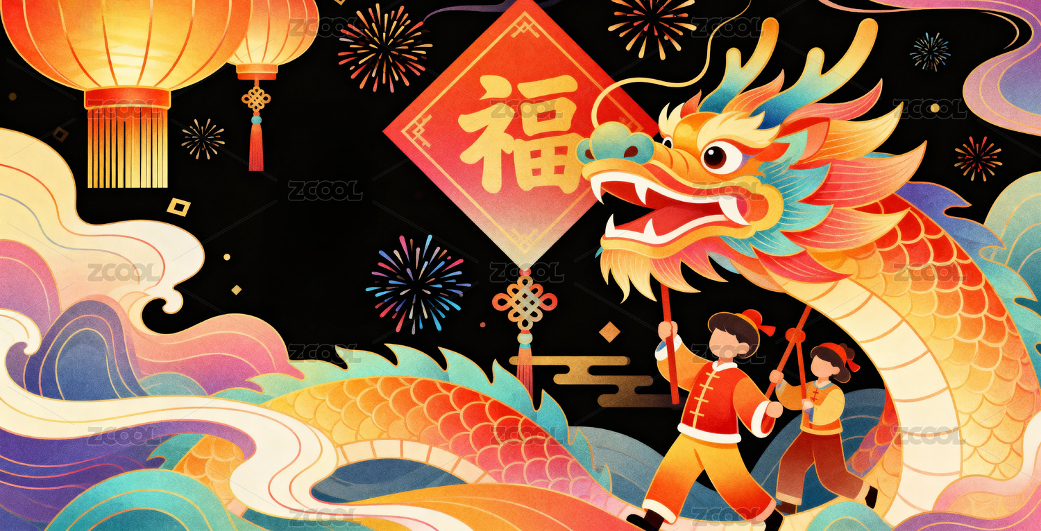 国潮中国新年春节喜庆醒狮贺新年新春插画