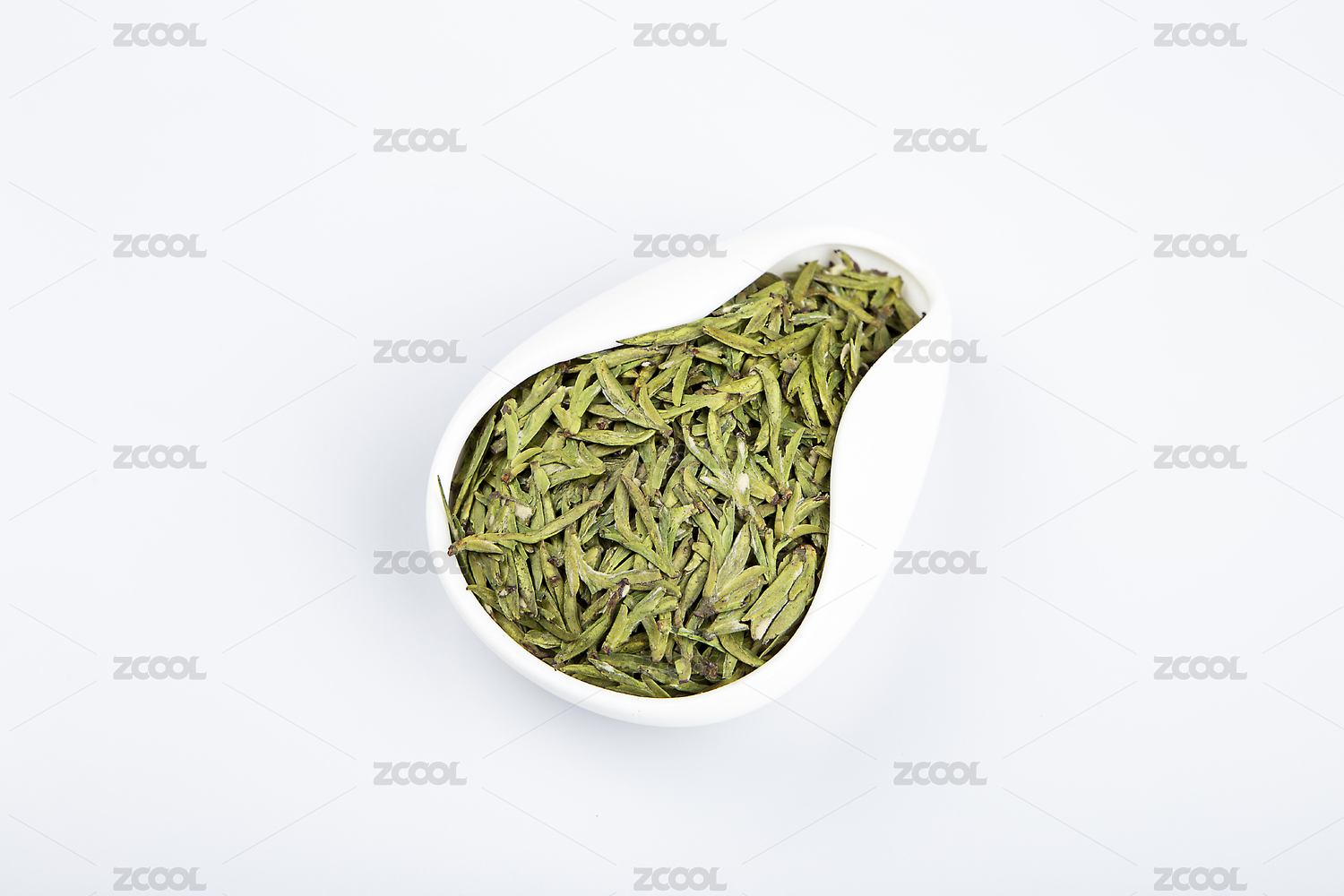 白瓷茶荷里装满了嫩绿色的狮峰西湖龙井