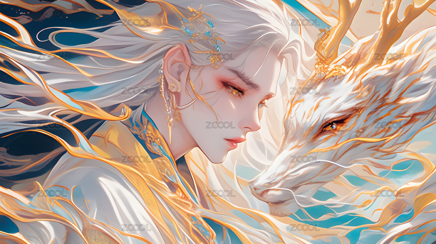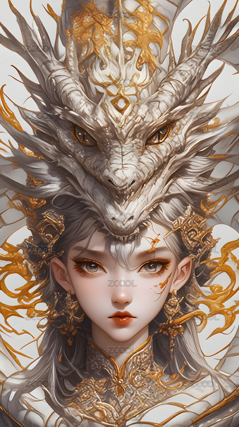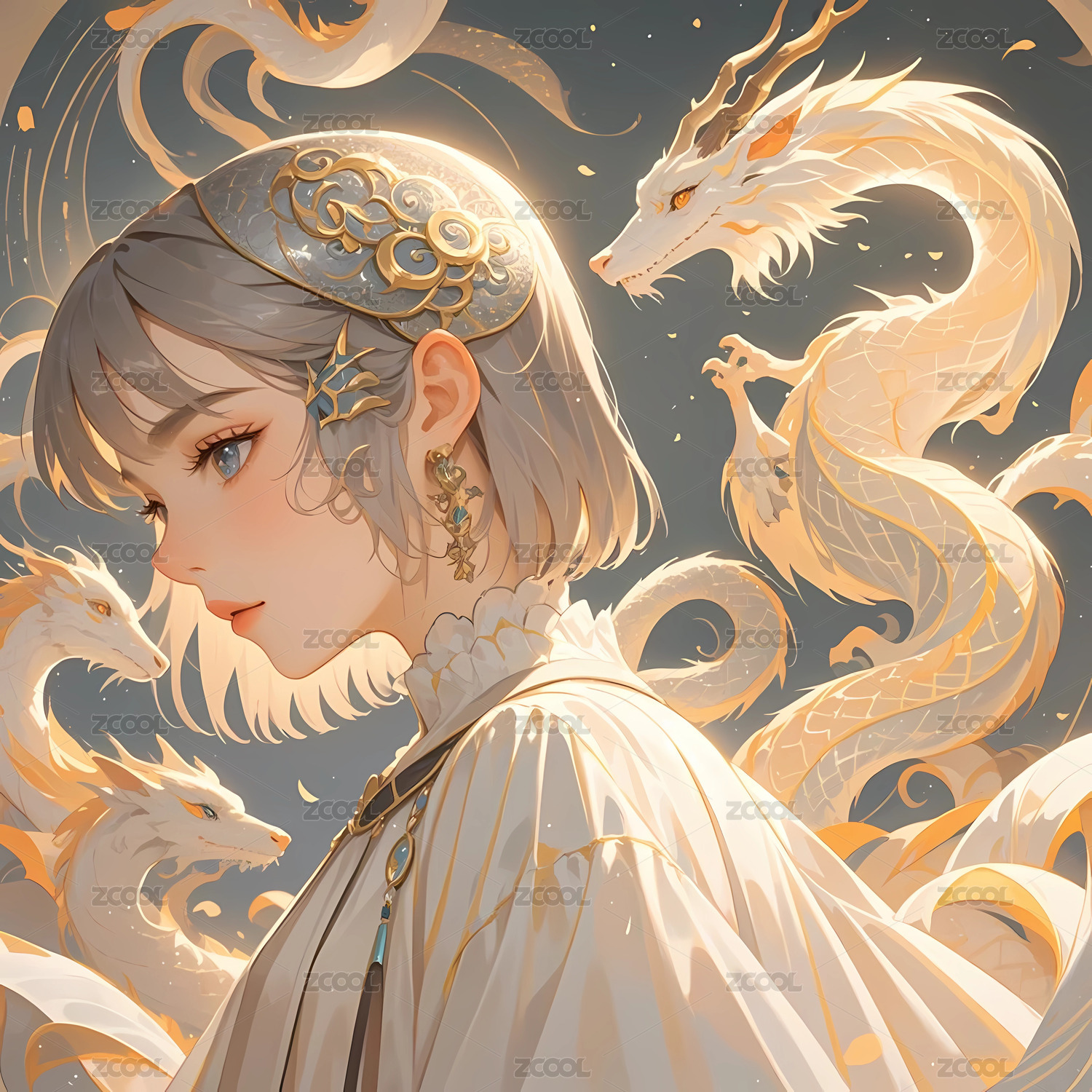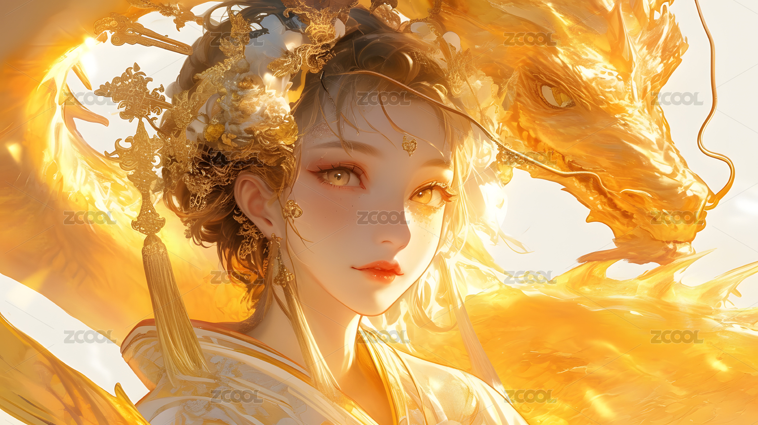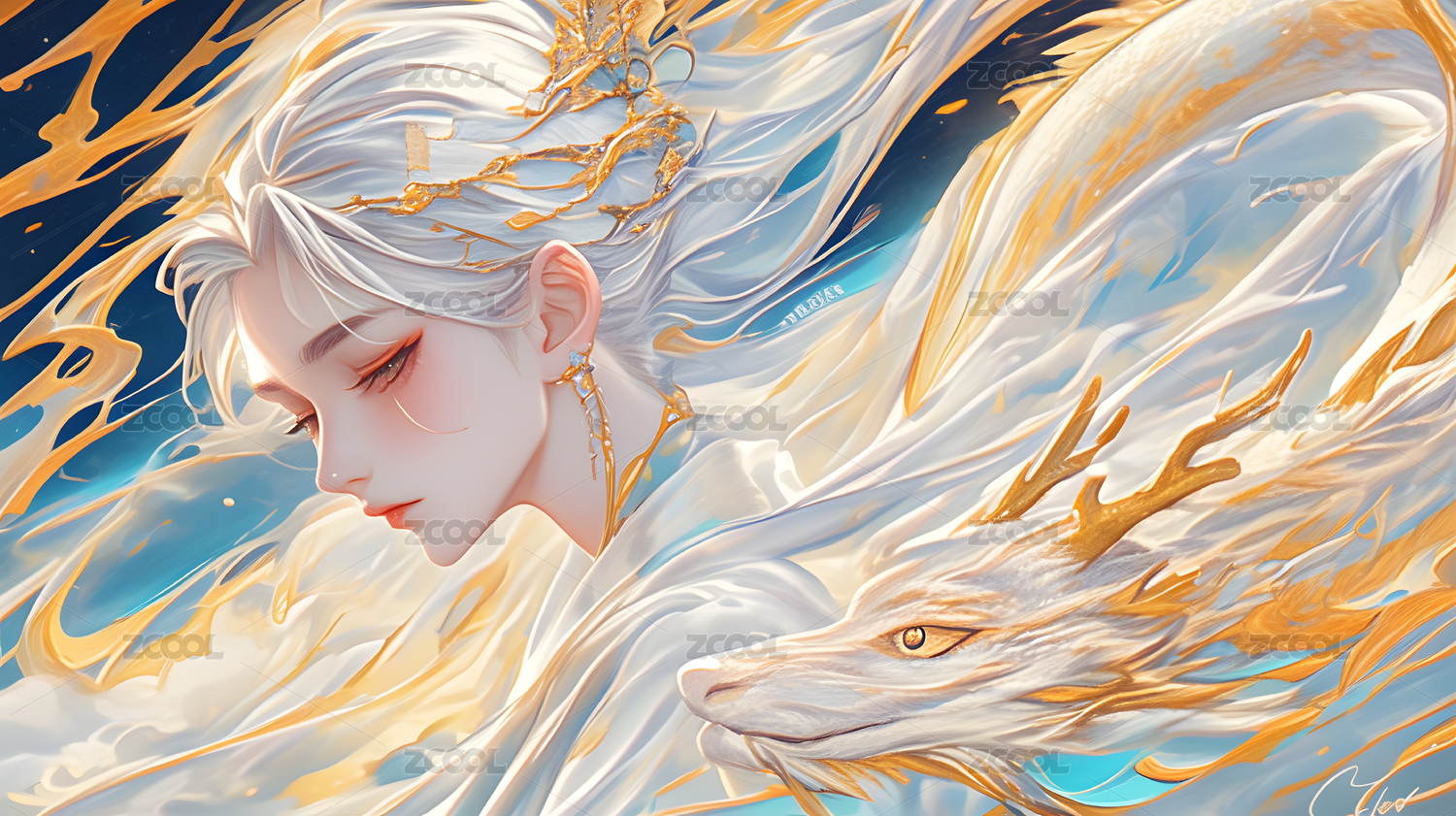 艺术,少女,金色,白色,唯美,梦幻,奇幻,金龙,相遇,光泽