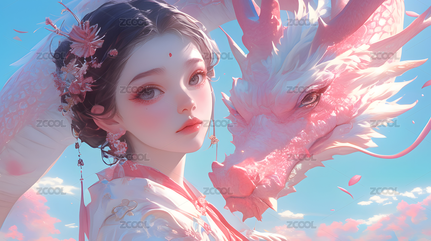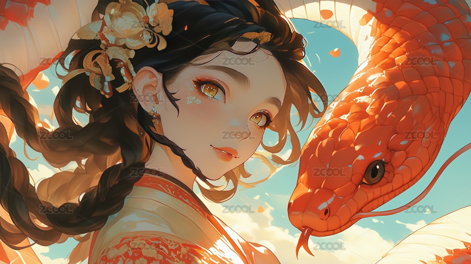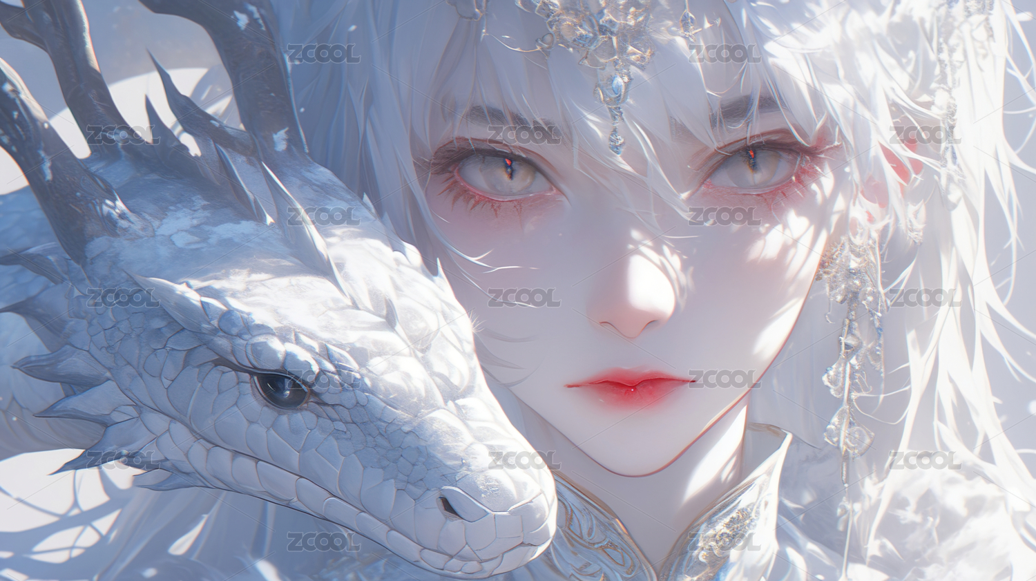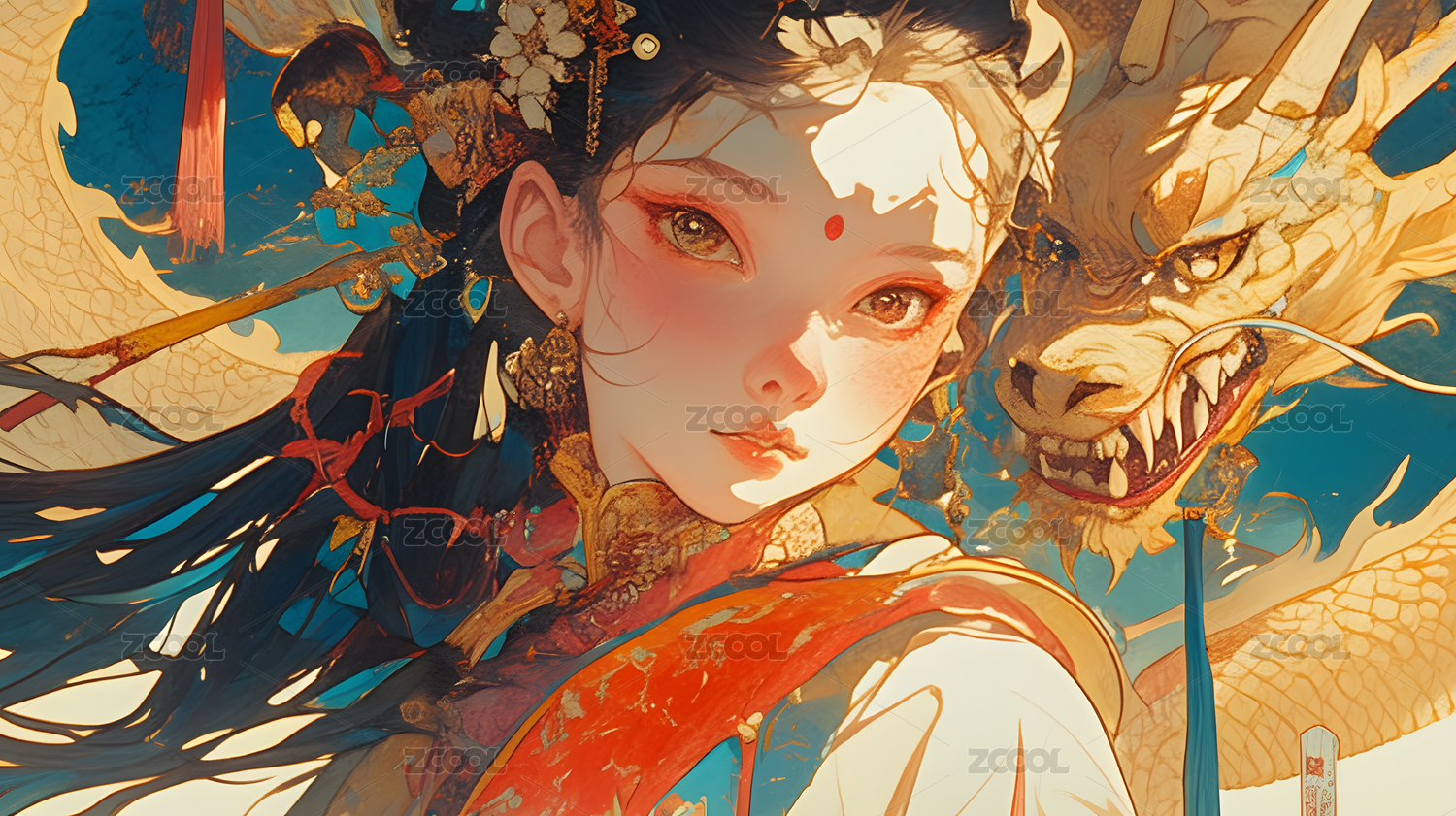 艺术,少女,金色,白色,唯美,梦幻,奇幻,金龙,相遇,光泽