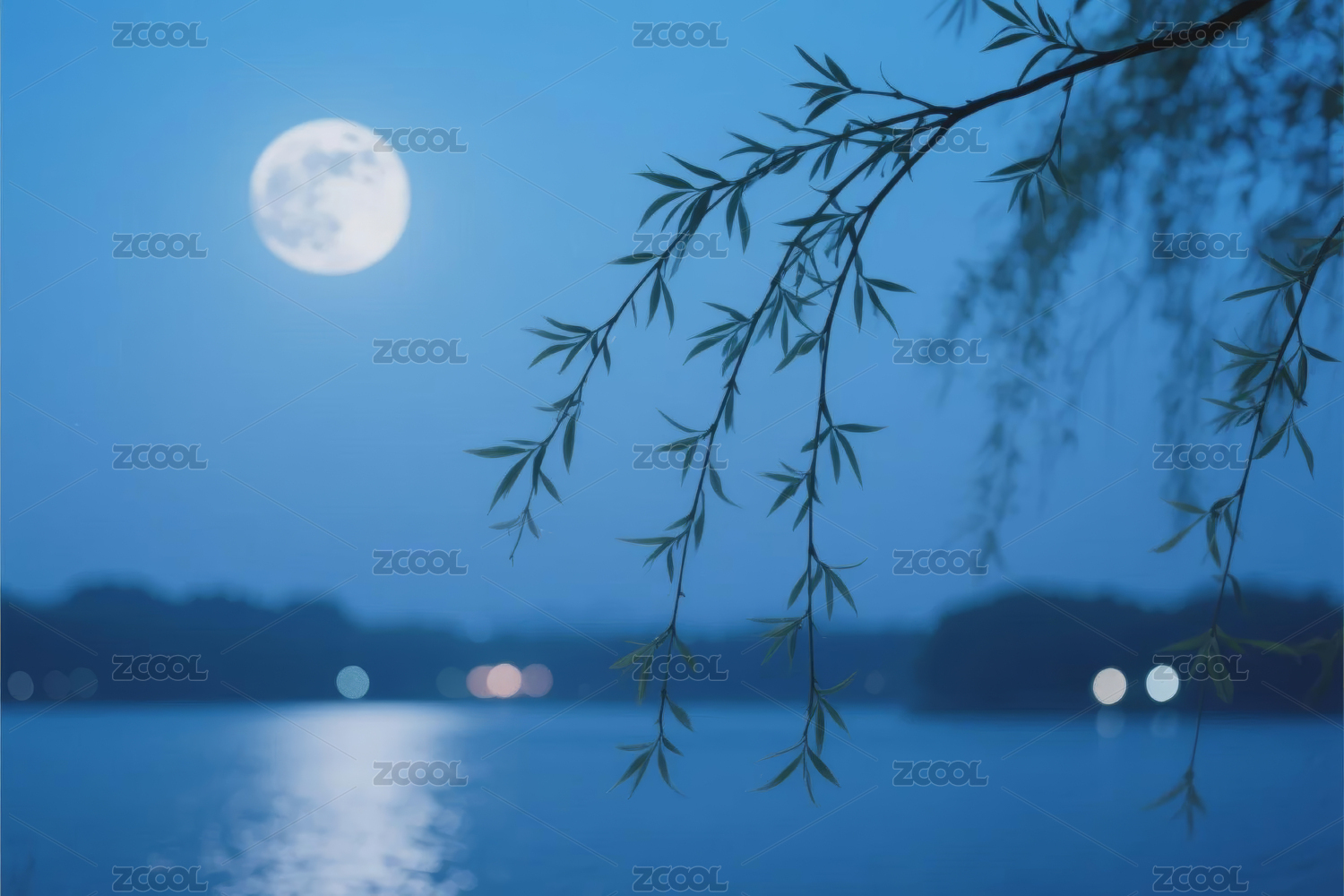 月夜湖畔柳枝