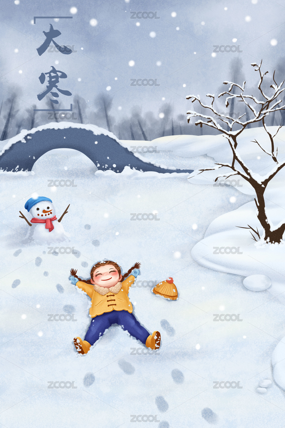 大寒节气腊八节女孩吃腊八粥赏雪景插画