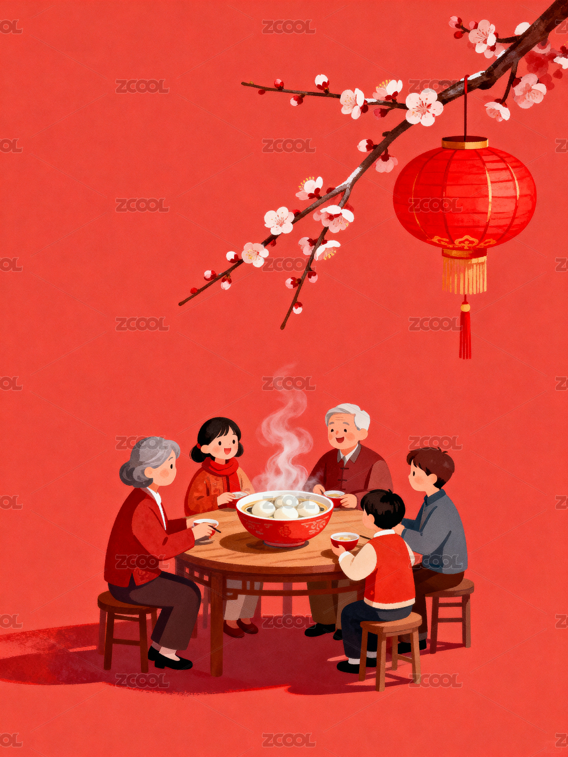 2020年鼠年春节除夕家庭团圆红色包饺子插画