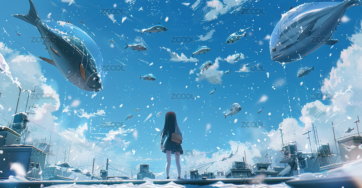 二次元,动漫,大海,人物,女孩,夏天,插画,绘画,海浪,鱼