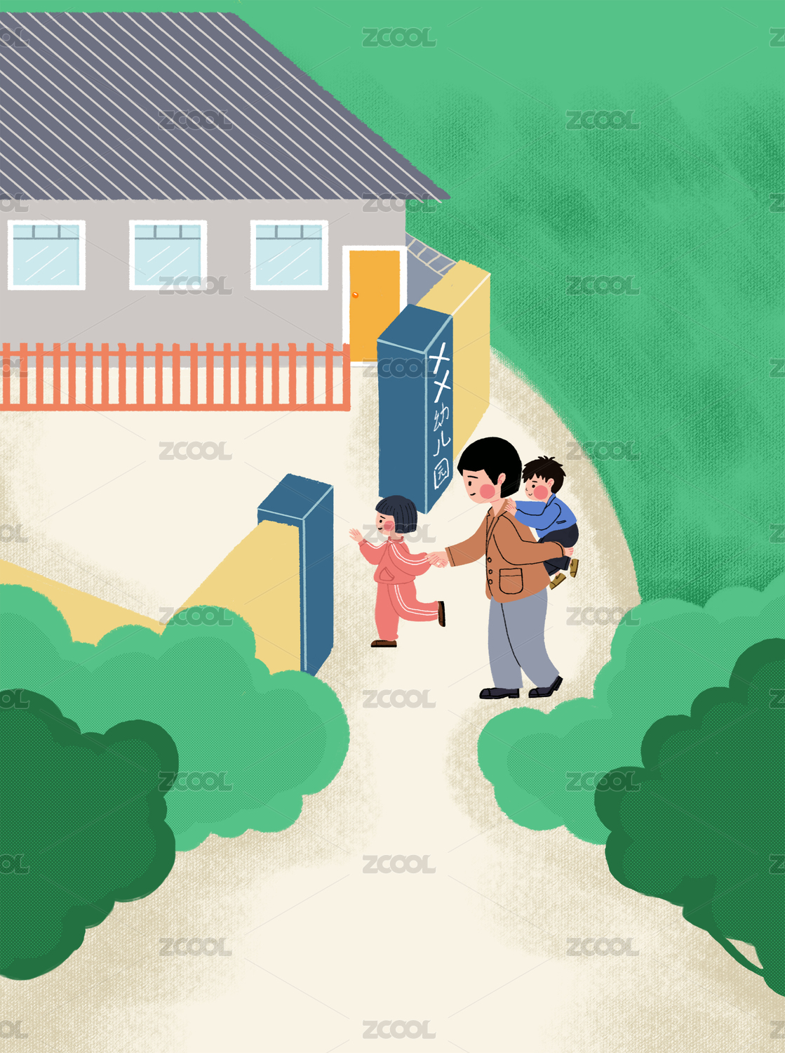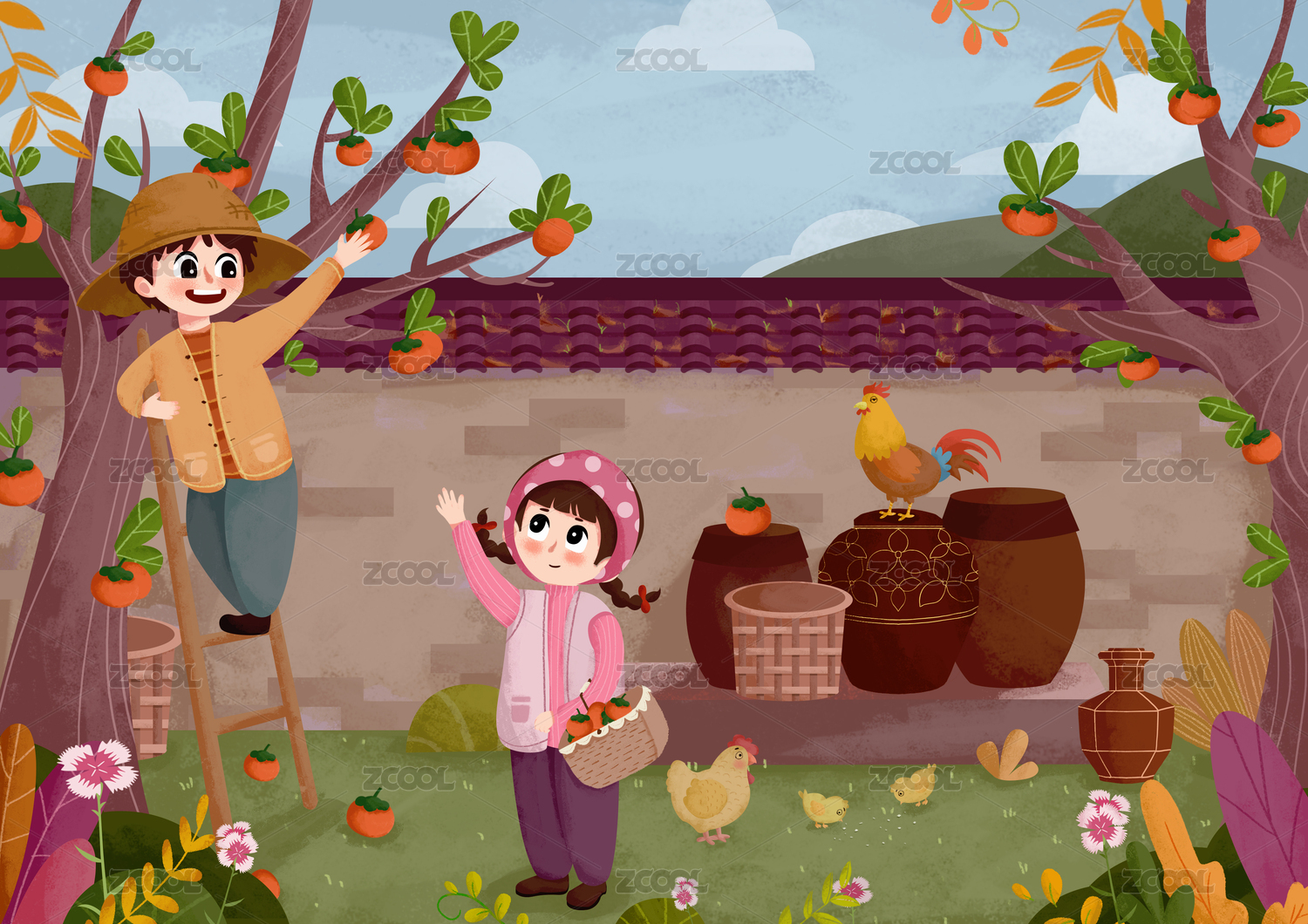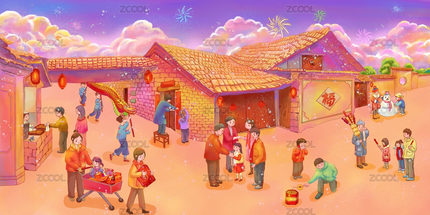 绿色,绘本,蓝色,黄色,绿草地,星空,村庄,插画