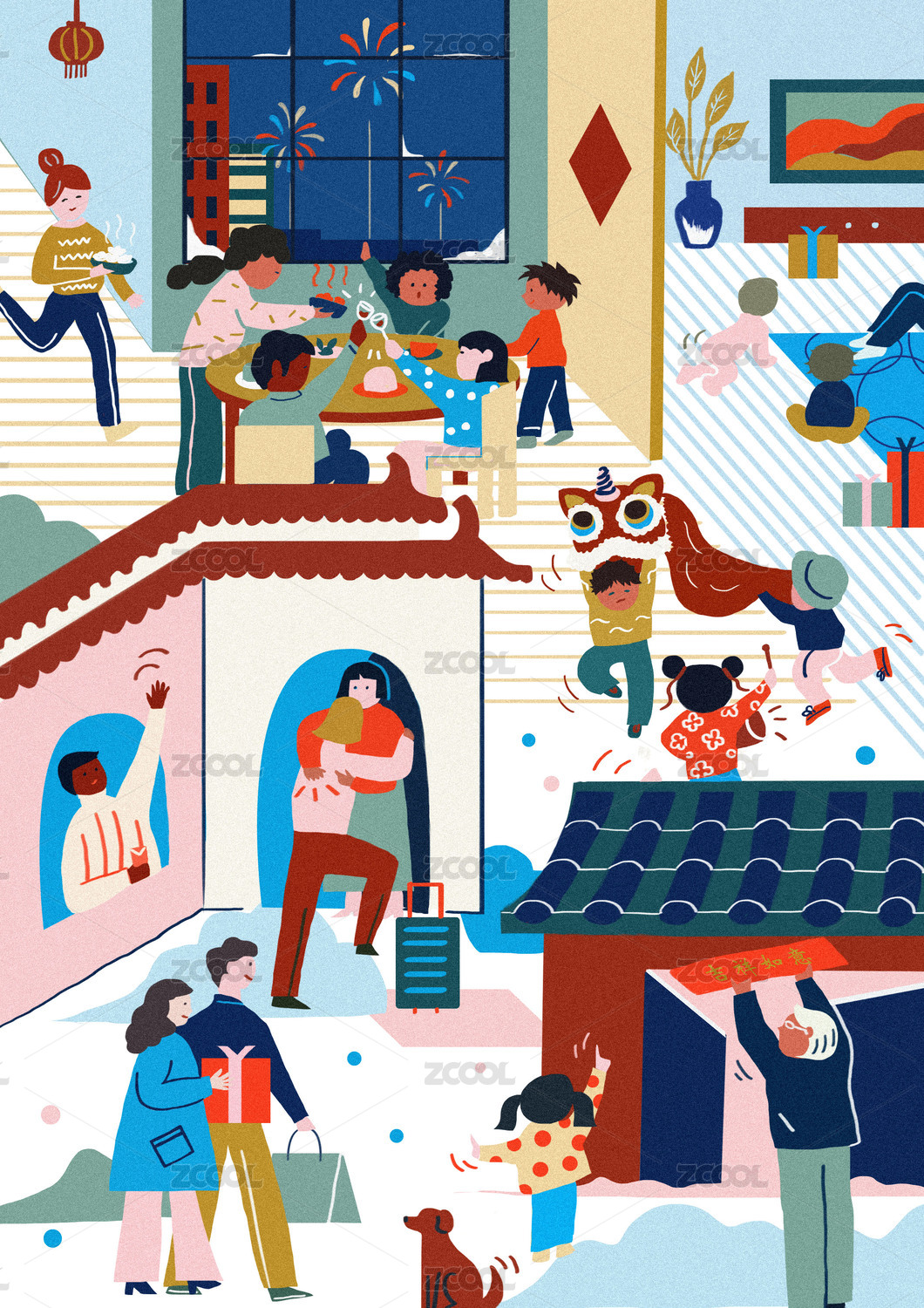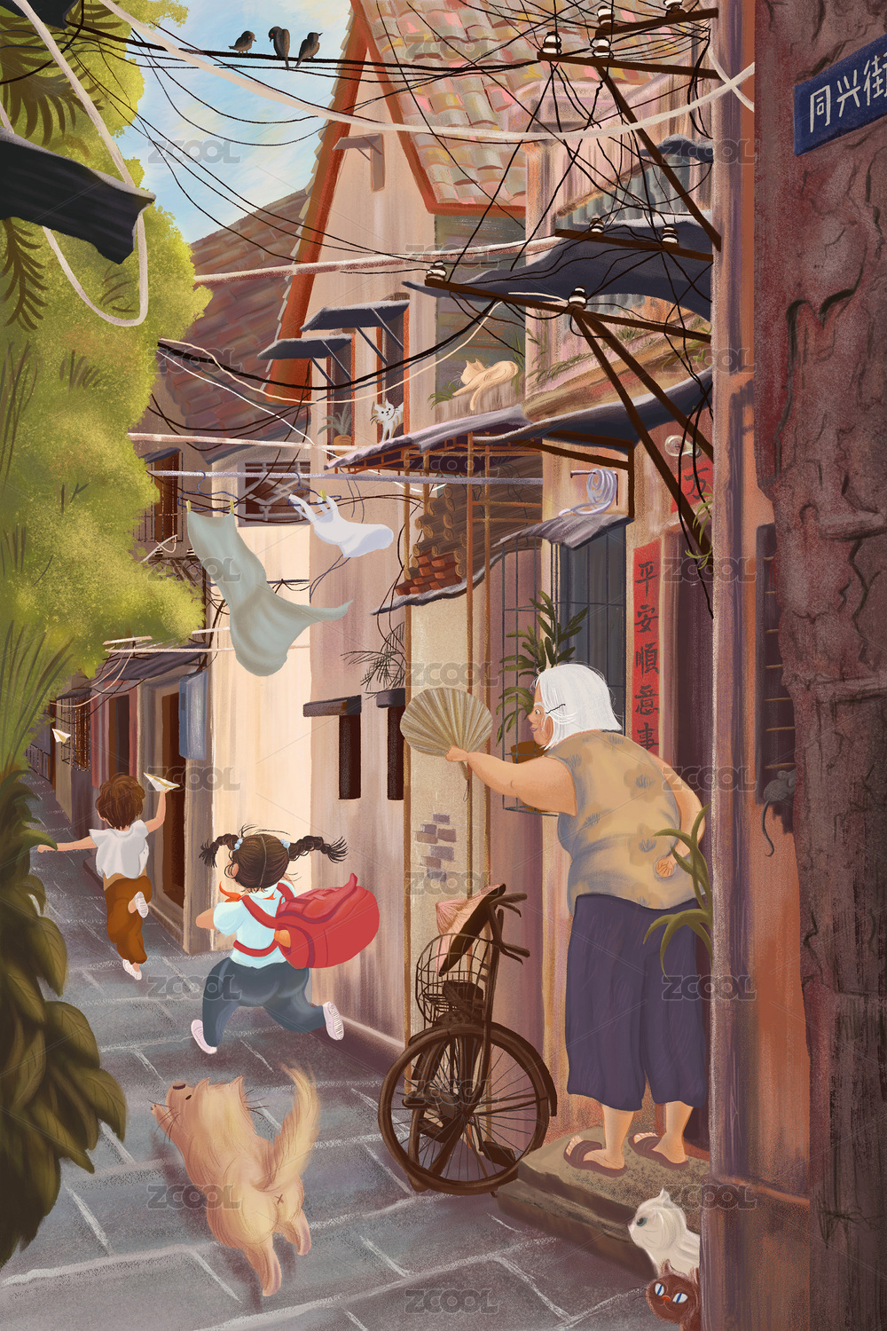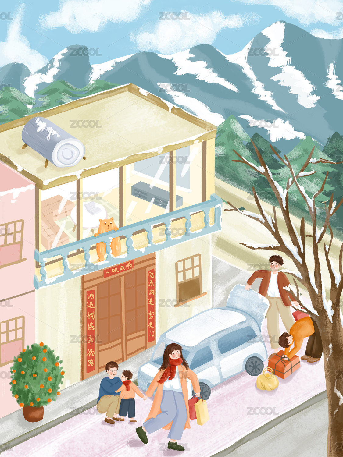 绿色,绘本,蓝色,黄色,绿草地,星空,村庄,插画