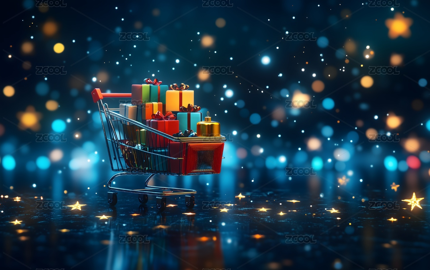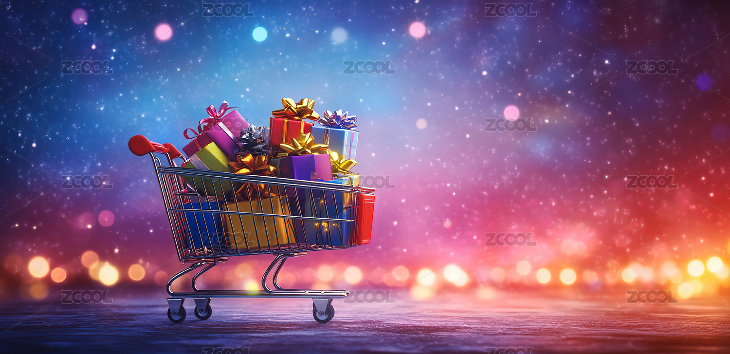 购物车中的礼物盒和五彩纸屑