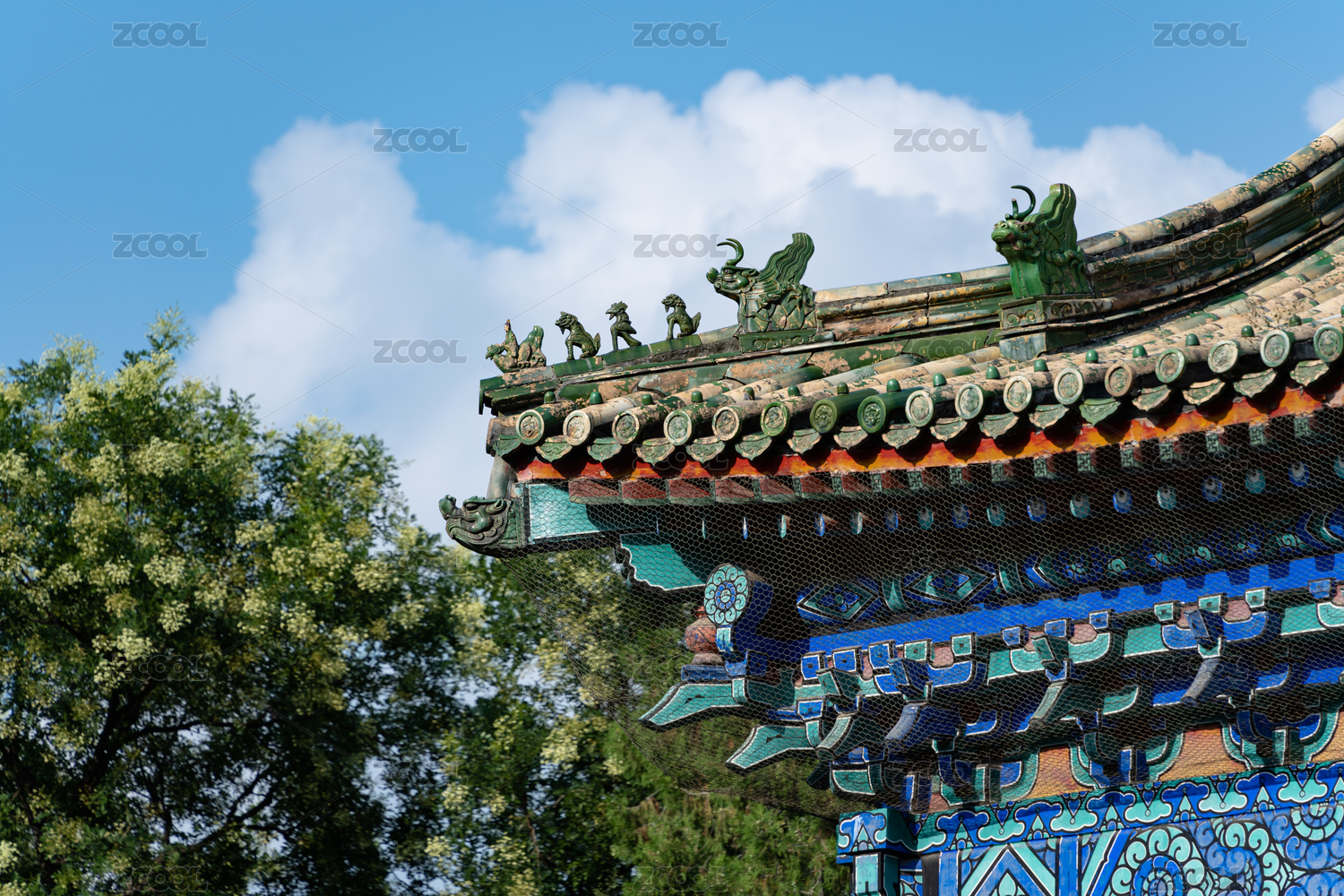蓝天白云下的天坛神厨绿色琉璃瓦屋顶