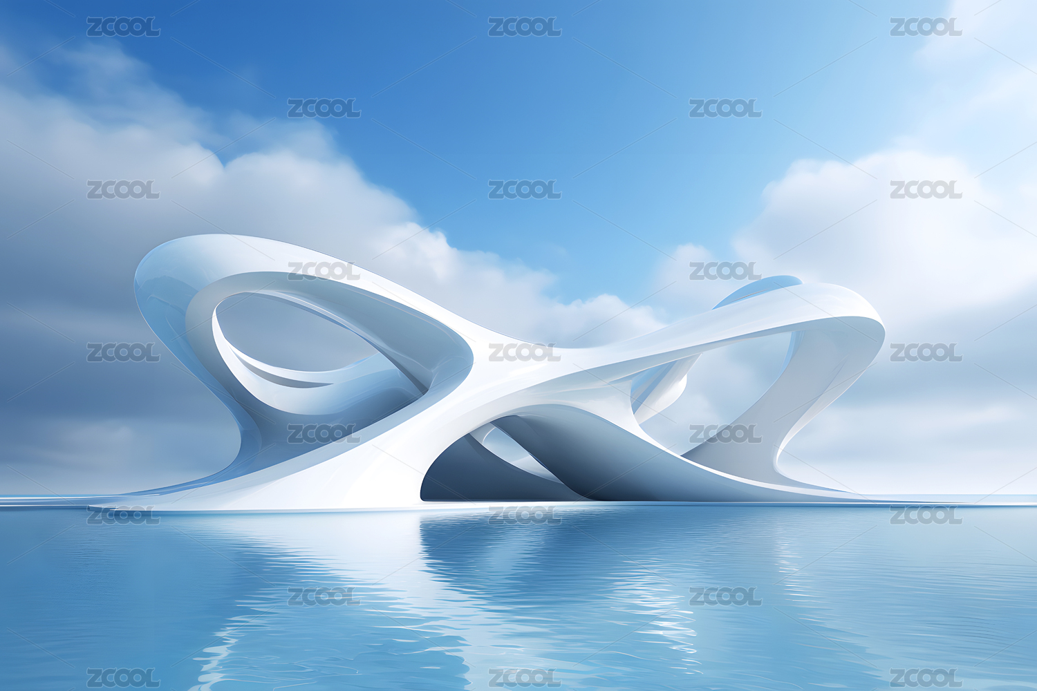 白色流线型雕塑与倒影
