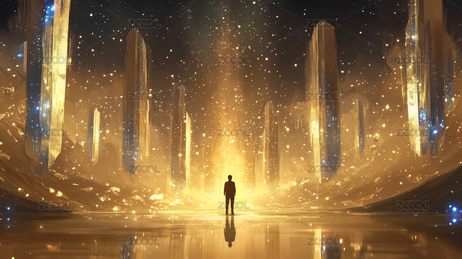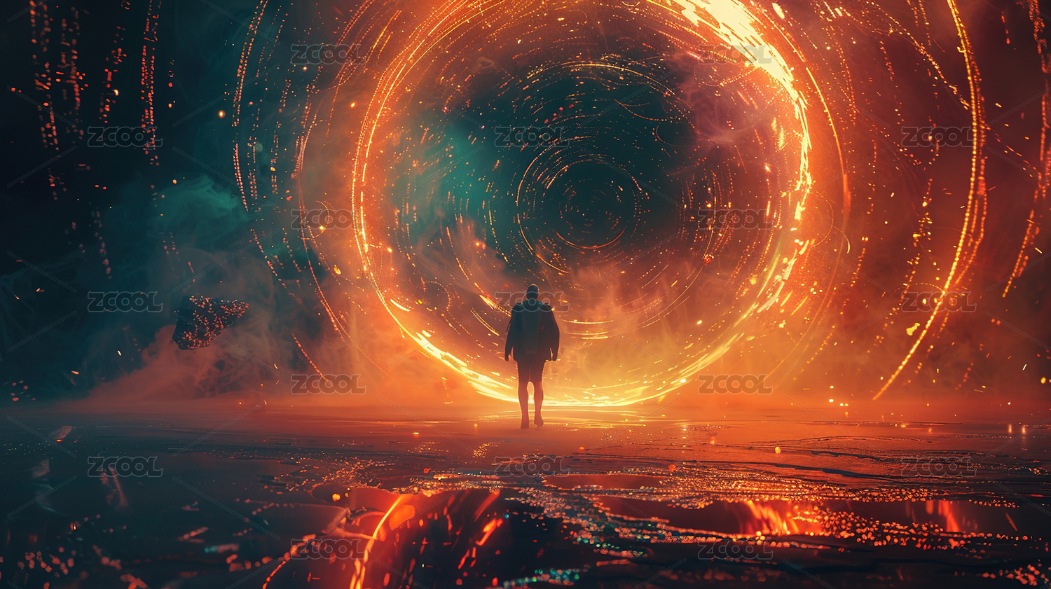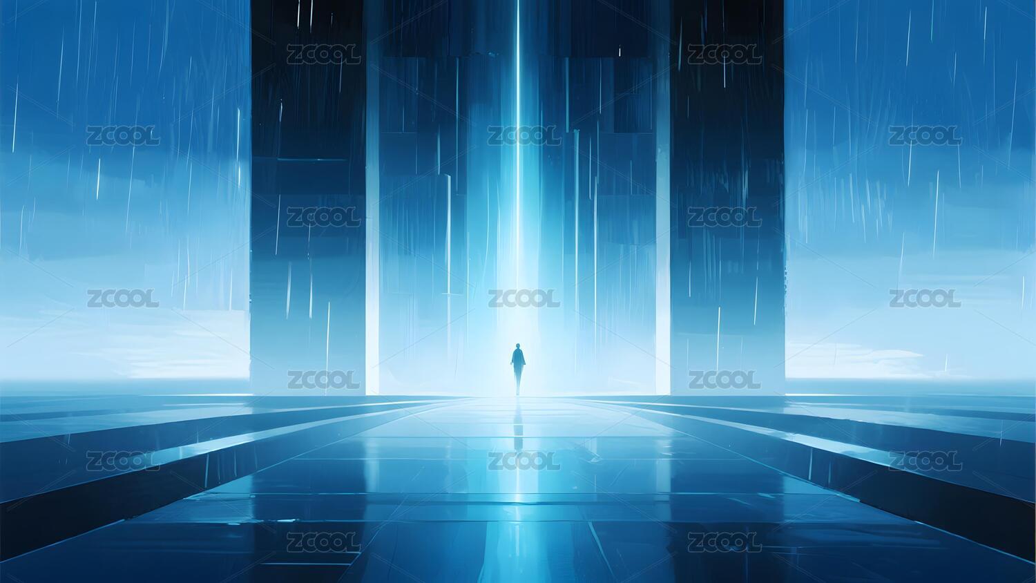 人物站在科幻未来之门前