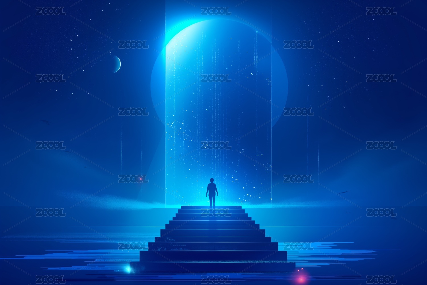 一个人走上阶梯来到一个巨大发光的门的面前