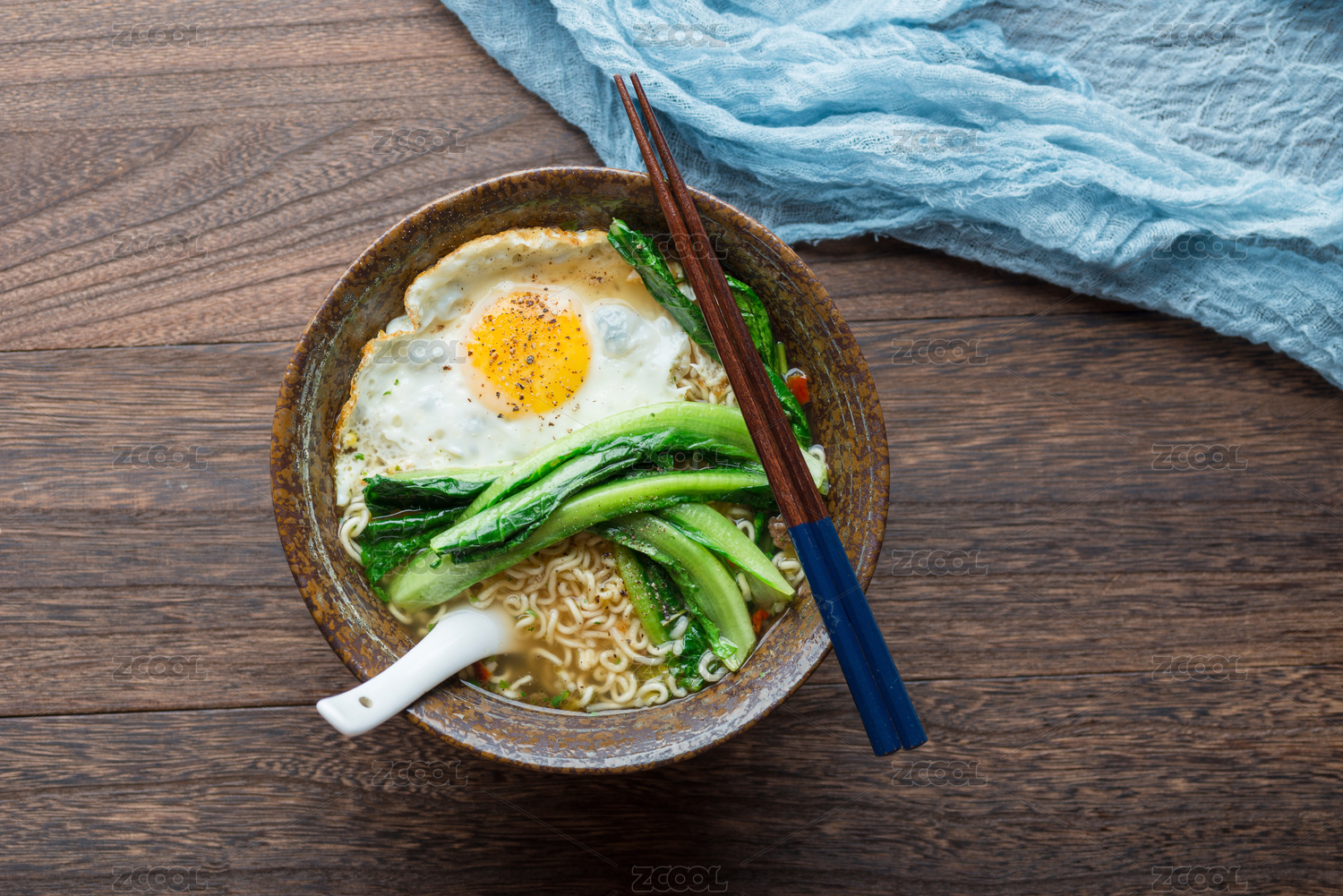 一碗搭配有溏心煎蛋和青菜的泡面