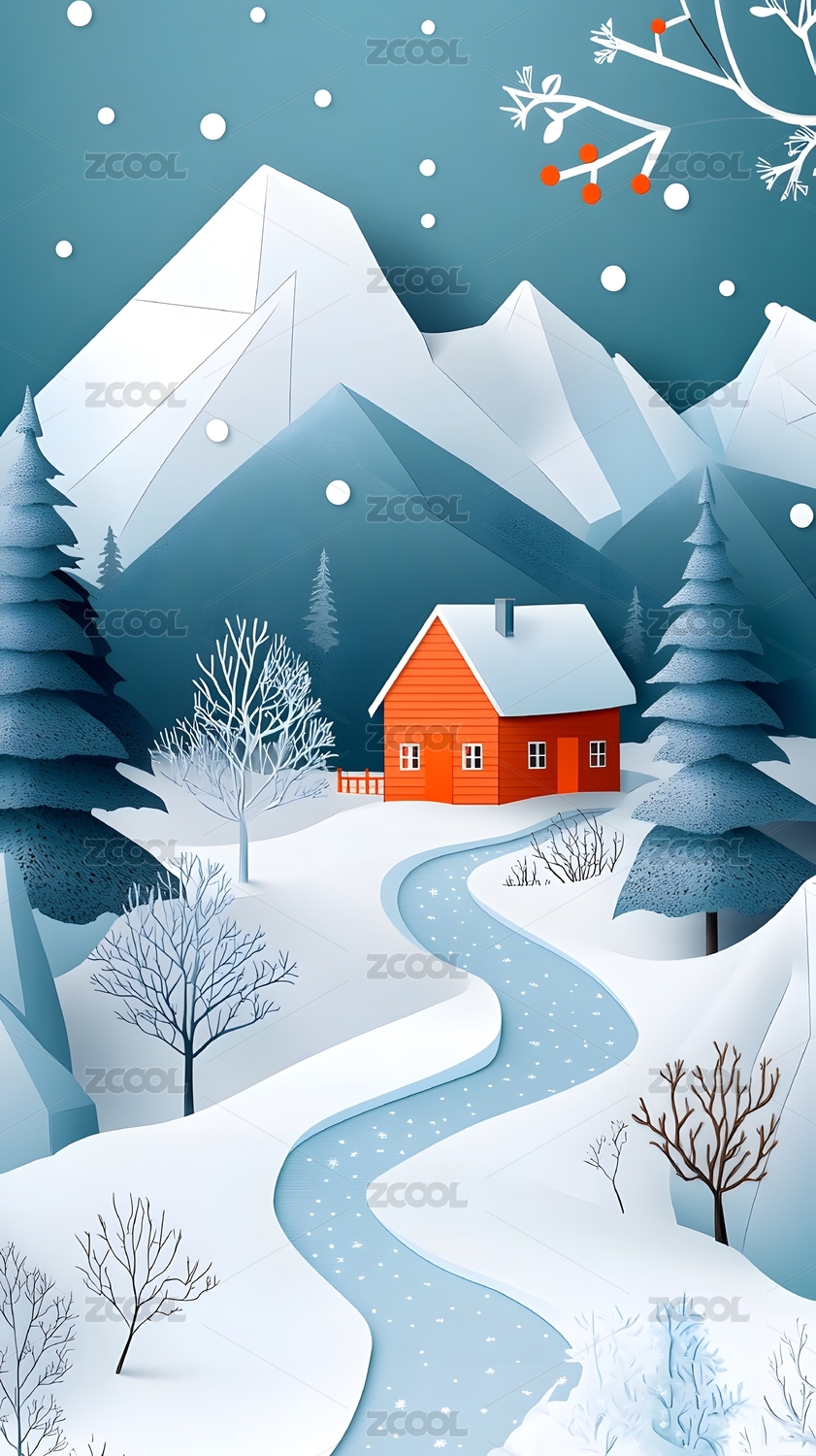 冬日雪景卡通木屋