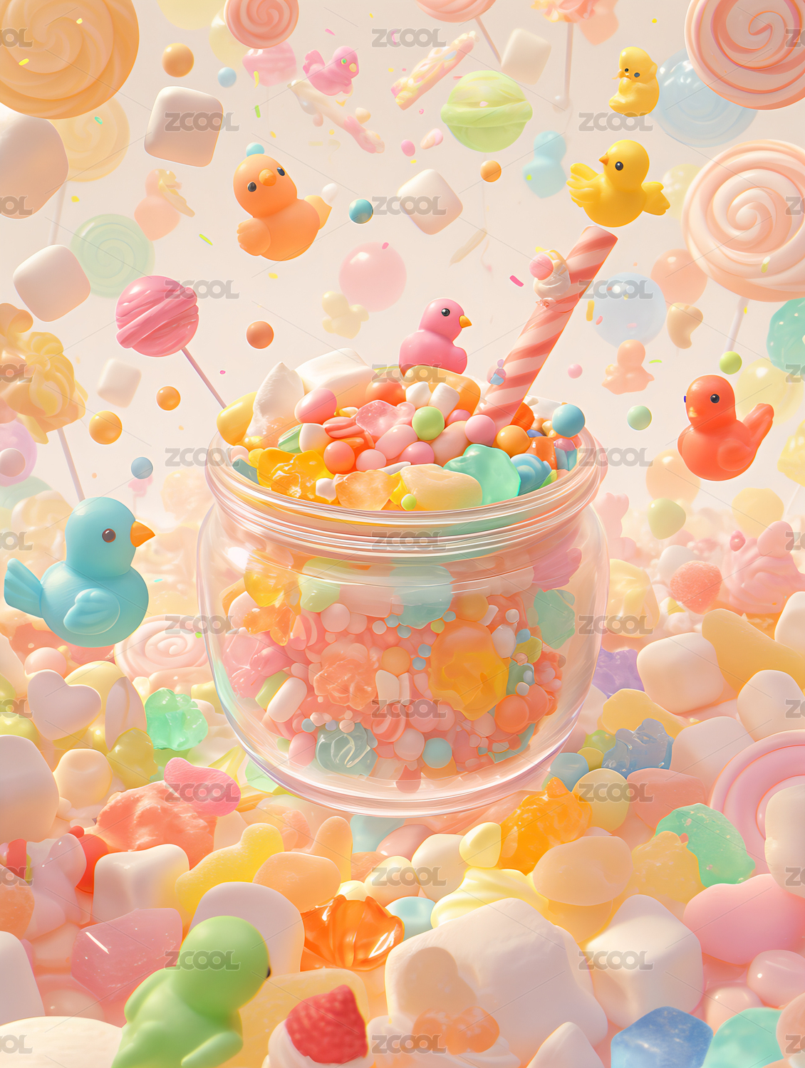 糖果罐中的童话世界棉花糖和橡皮糖糖果