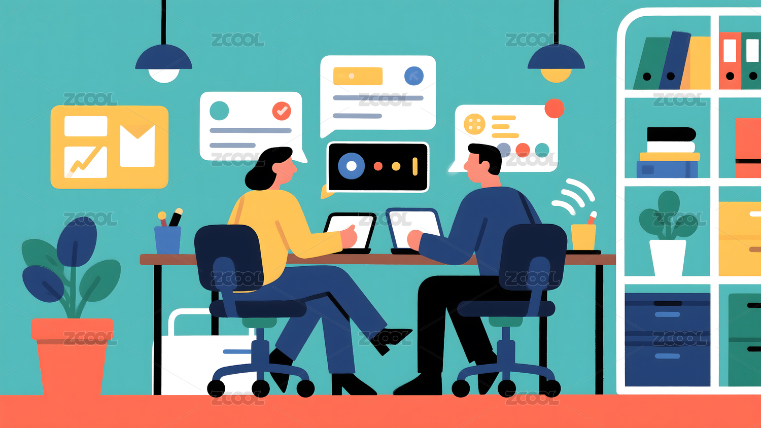 工作中的男女愉快讨论KPI完成情况,矢量扁平概念插画