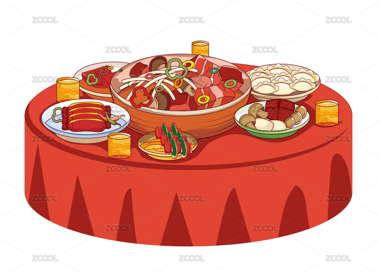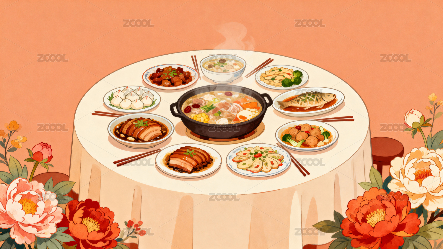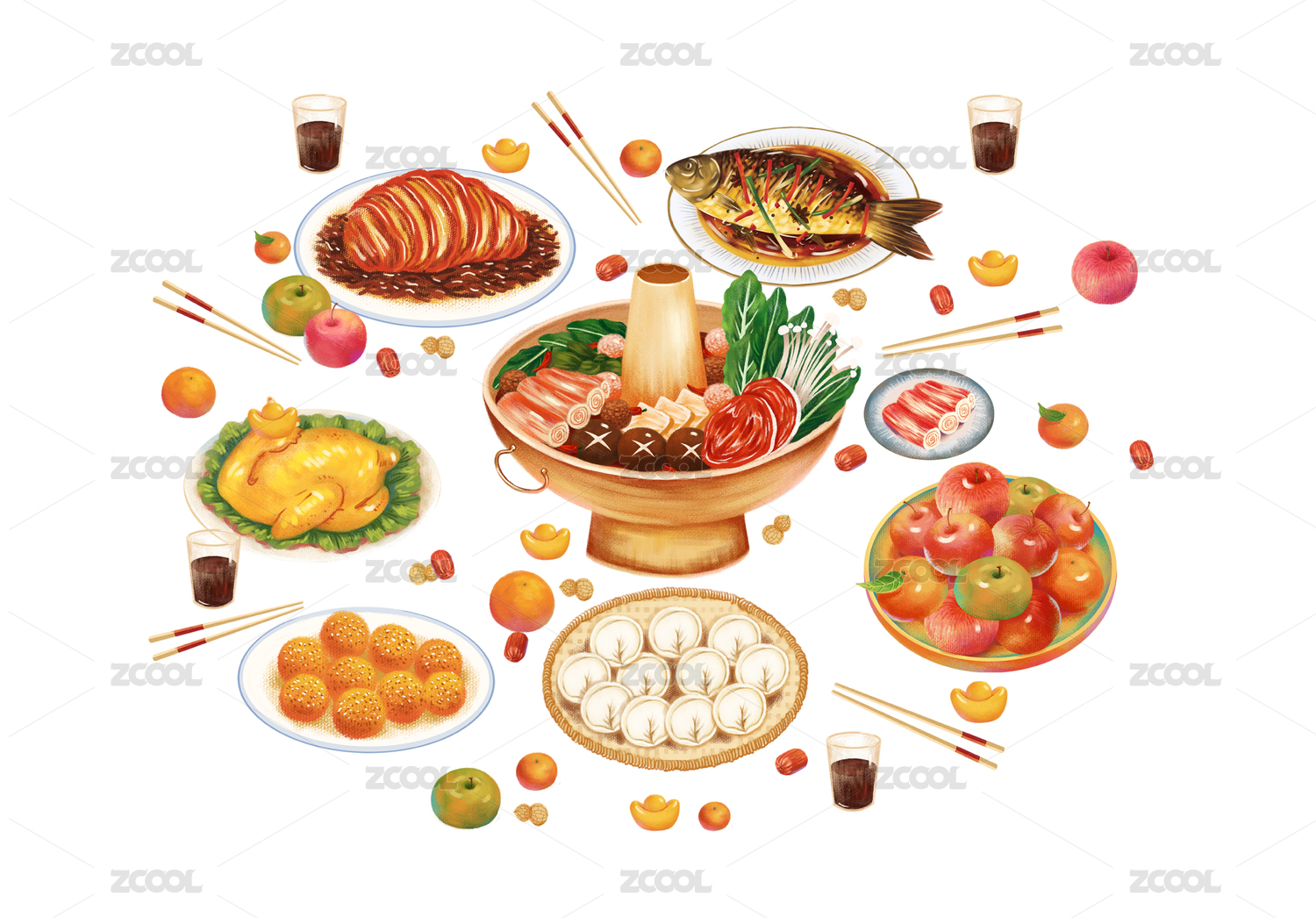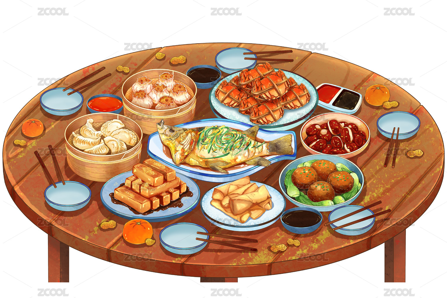 插画,色彩,温馨,油焖大虾,红烧鱼,白灼青菜,烧鸡,呛炒藕片,四喜丸子,水饺