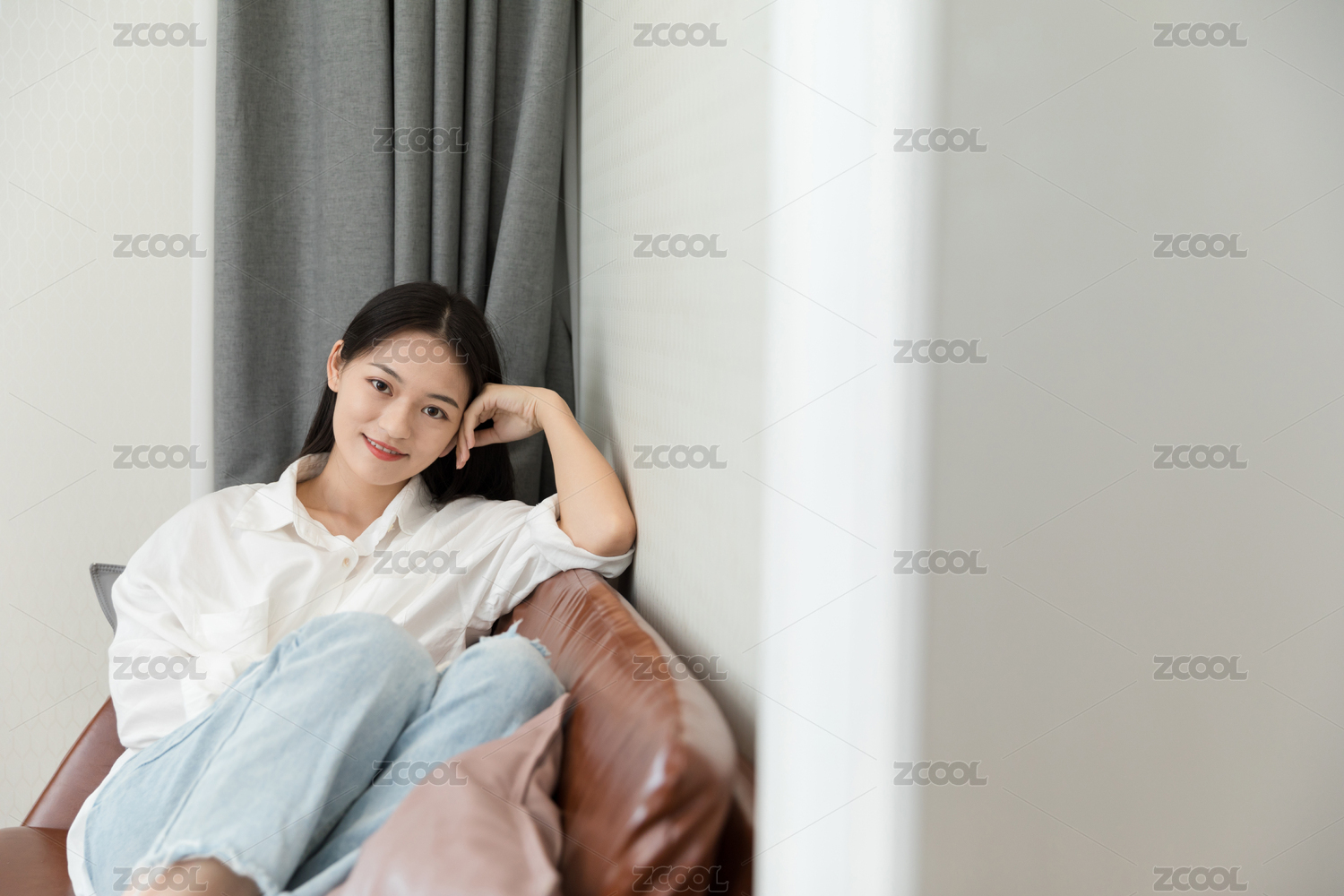 坐在沙发上的长发美女