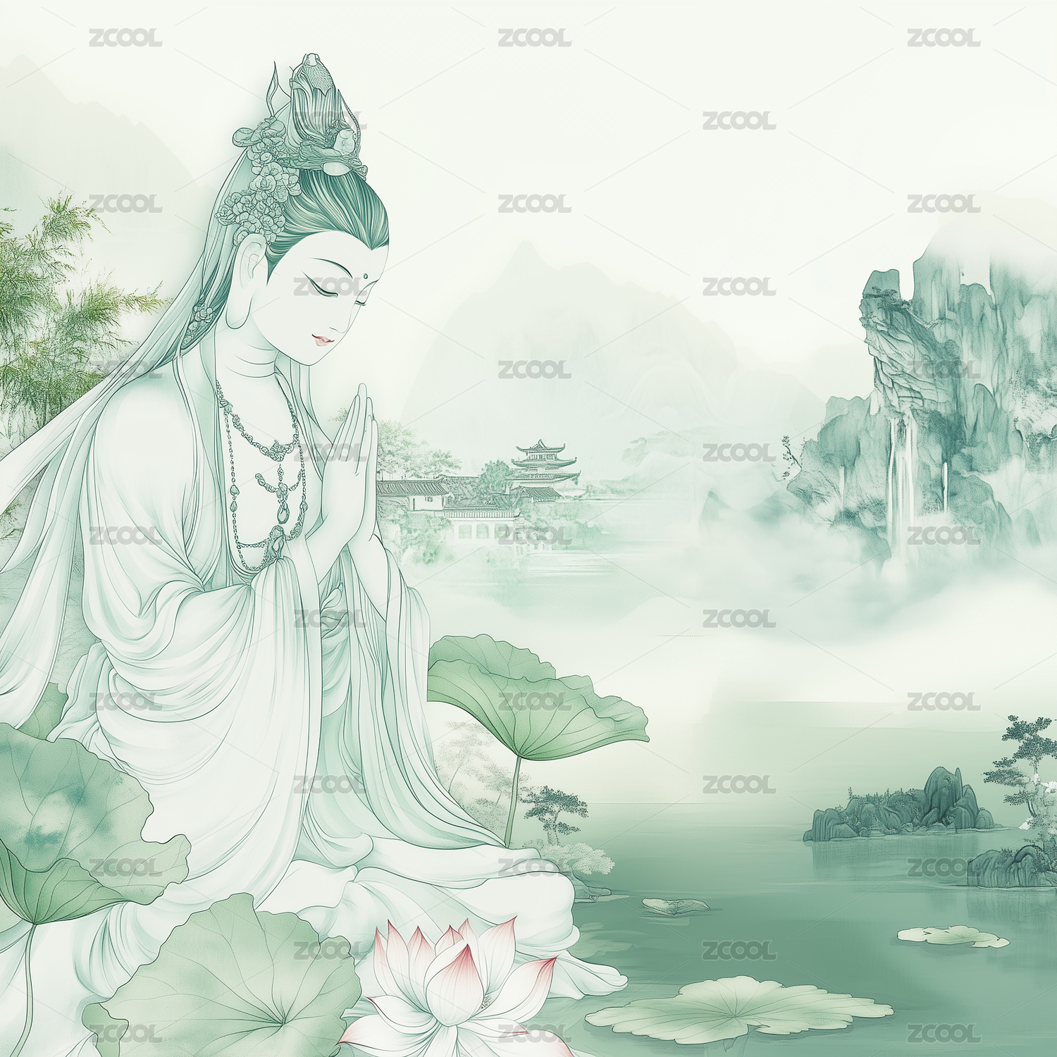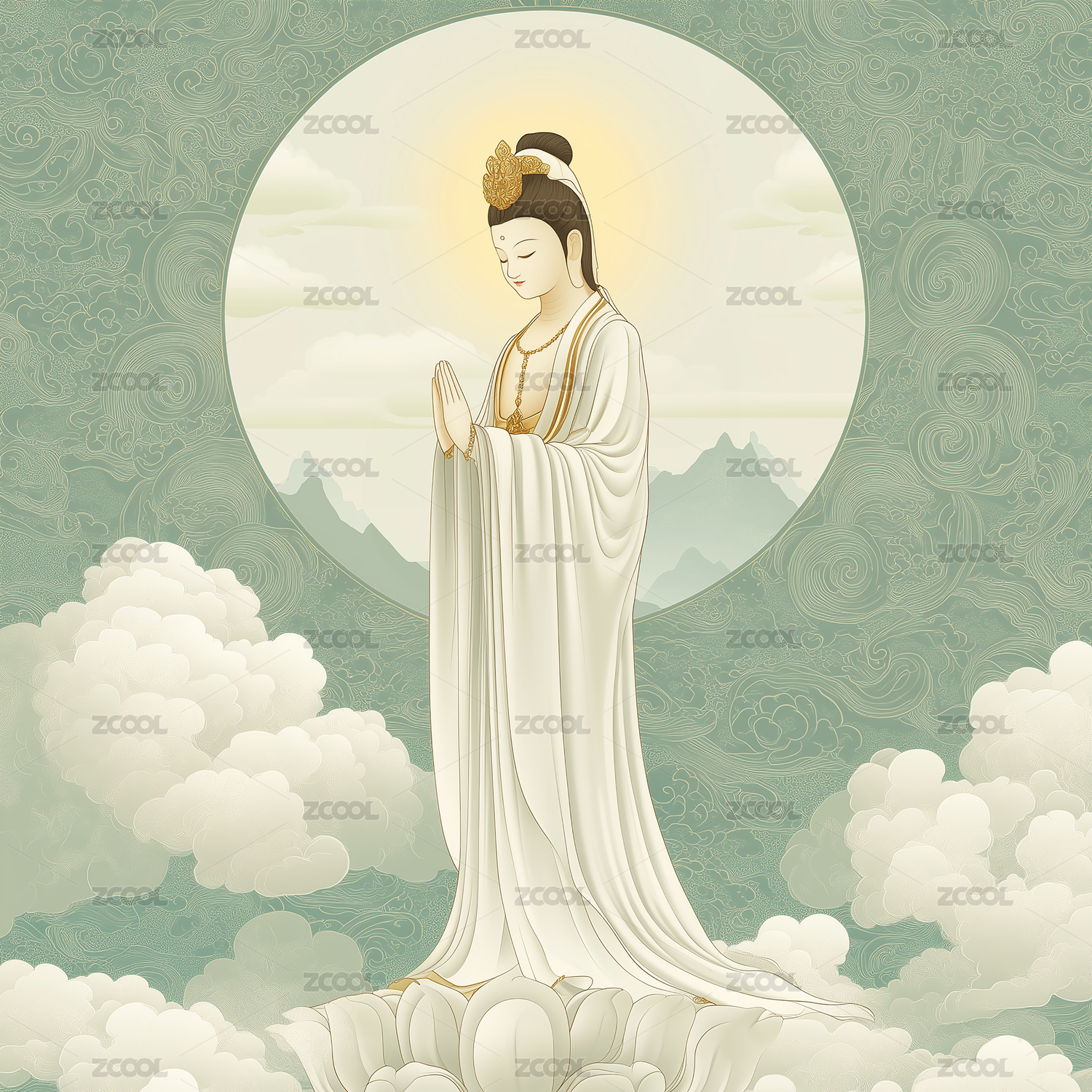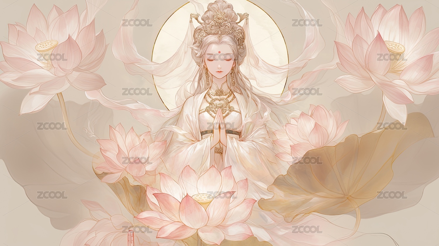 西游记神仙观音菩萨坐莲花上唯美梦幻插画