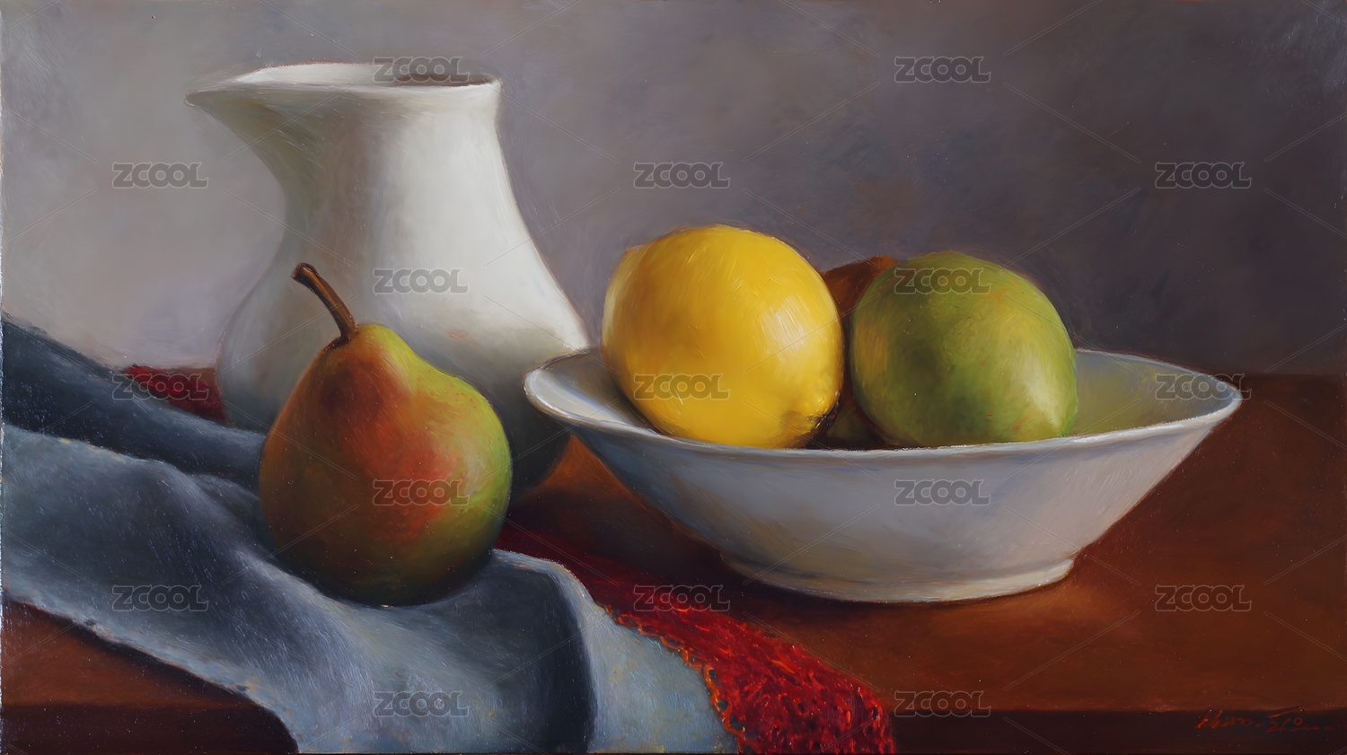 桌子上的花瓶、鲜花、水果,油画装饰画