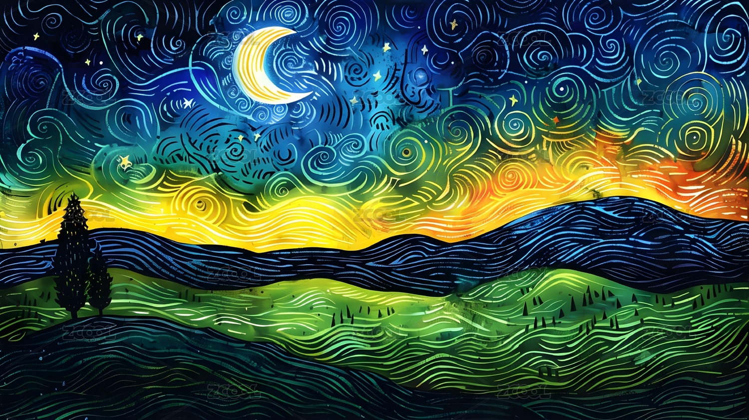 油画风星空下的树