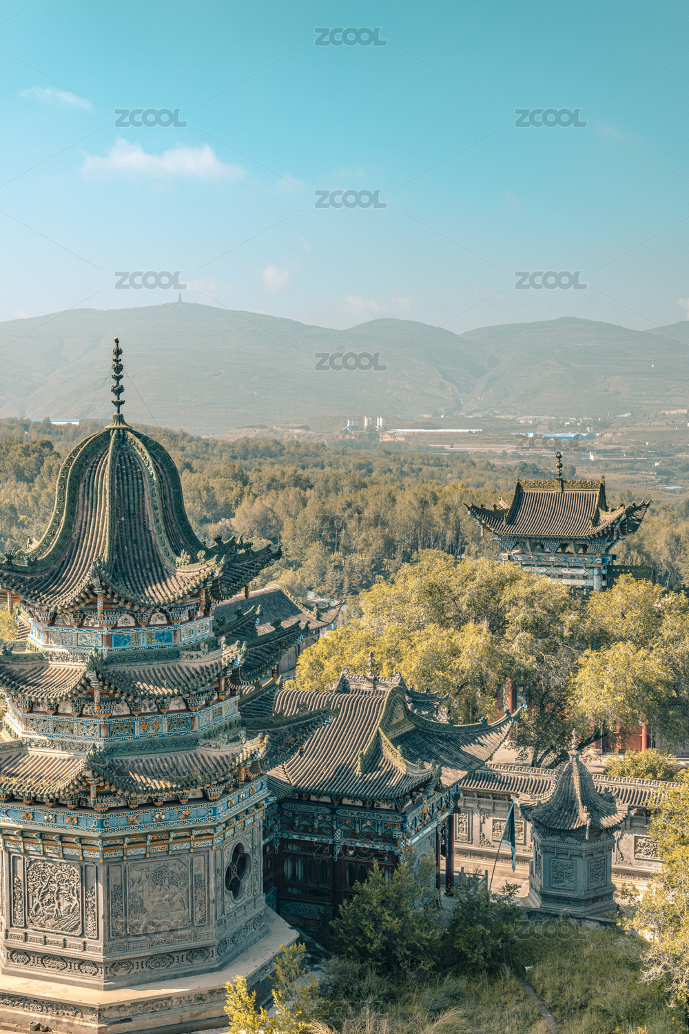 中国青海西宁南山公园上的古寺远眺