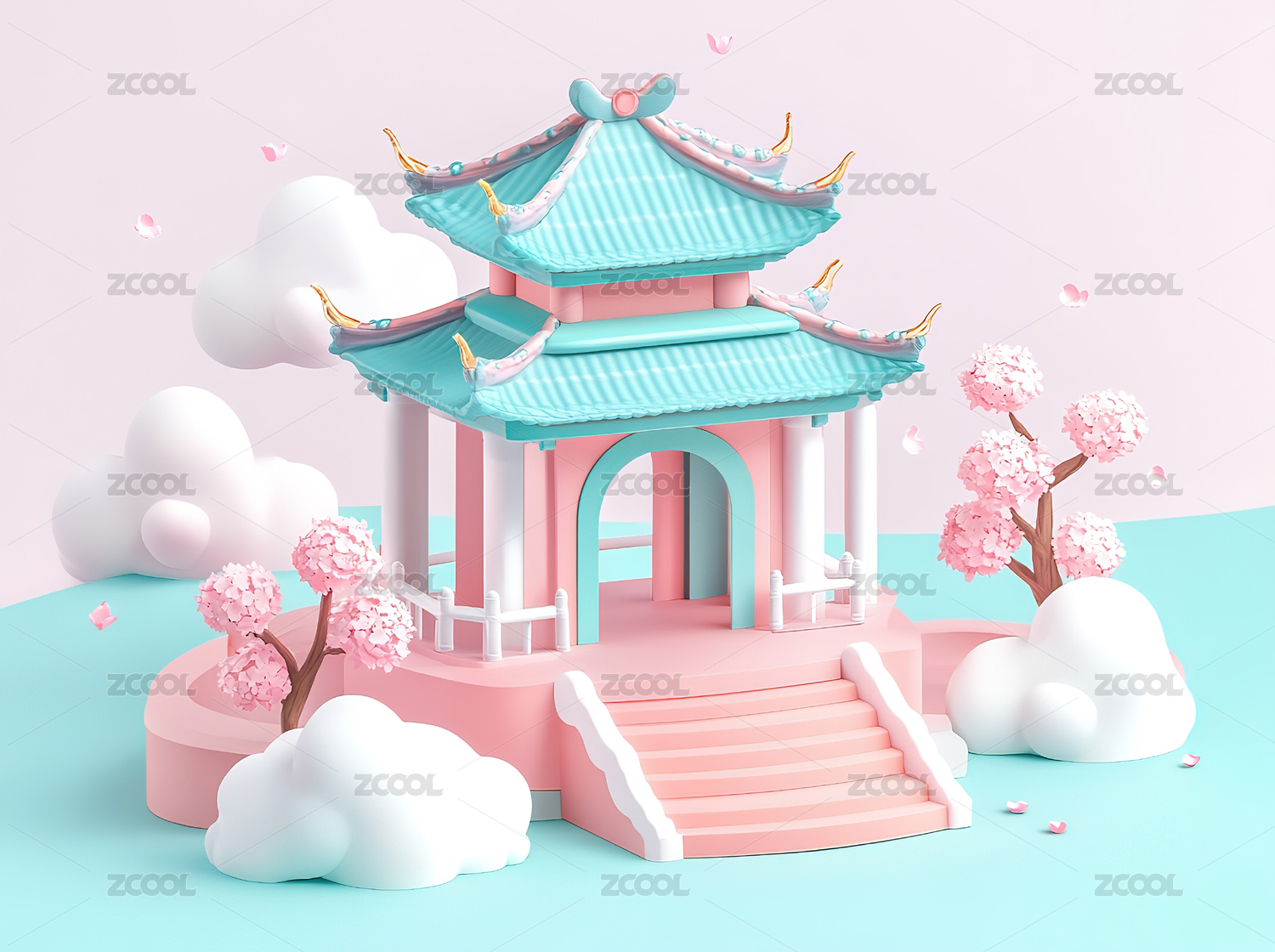 3D渲染中国风古建筑琉璃材质中式阁楼元素