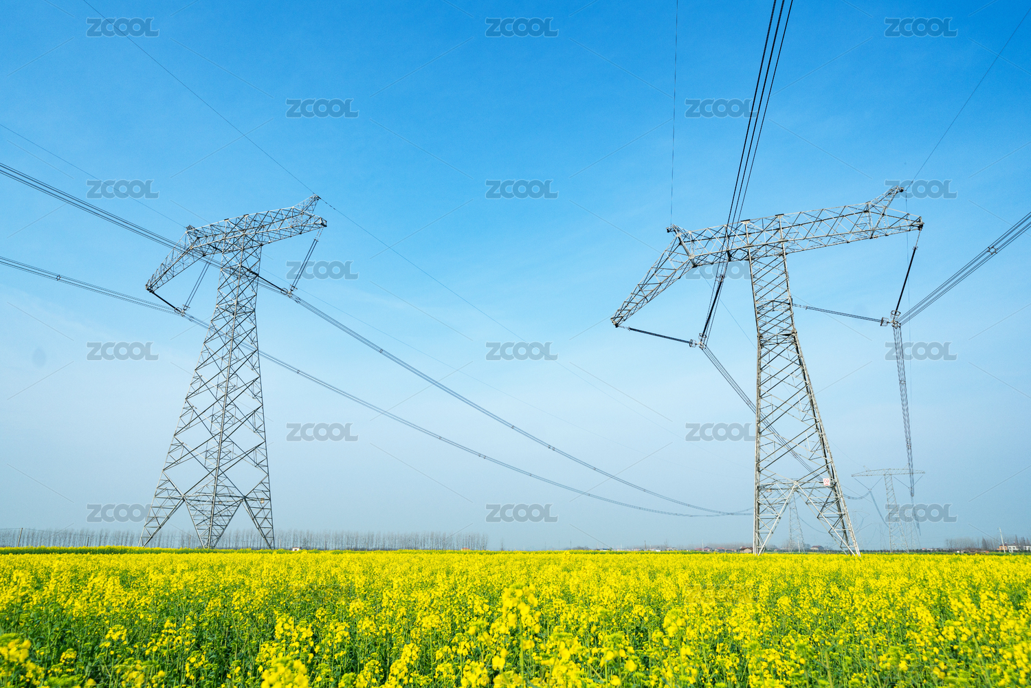 蓝天,油菜花,田地,电力,能源,基础建设,阳光,高压,输电塔,农业