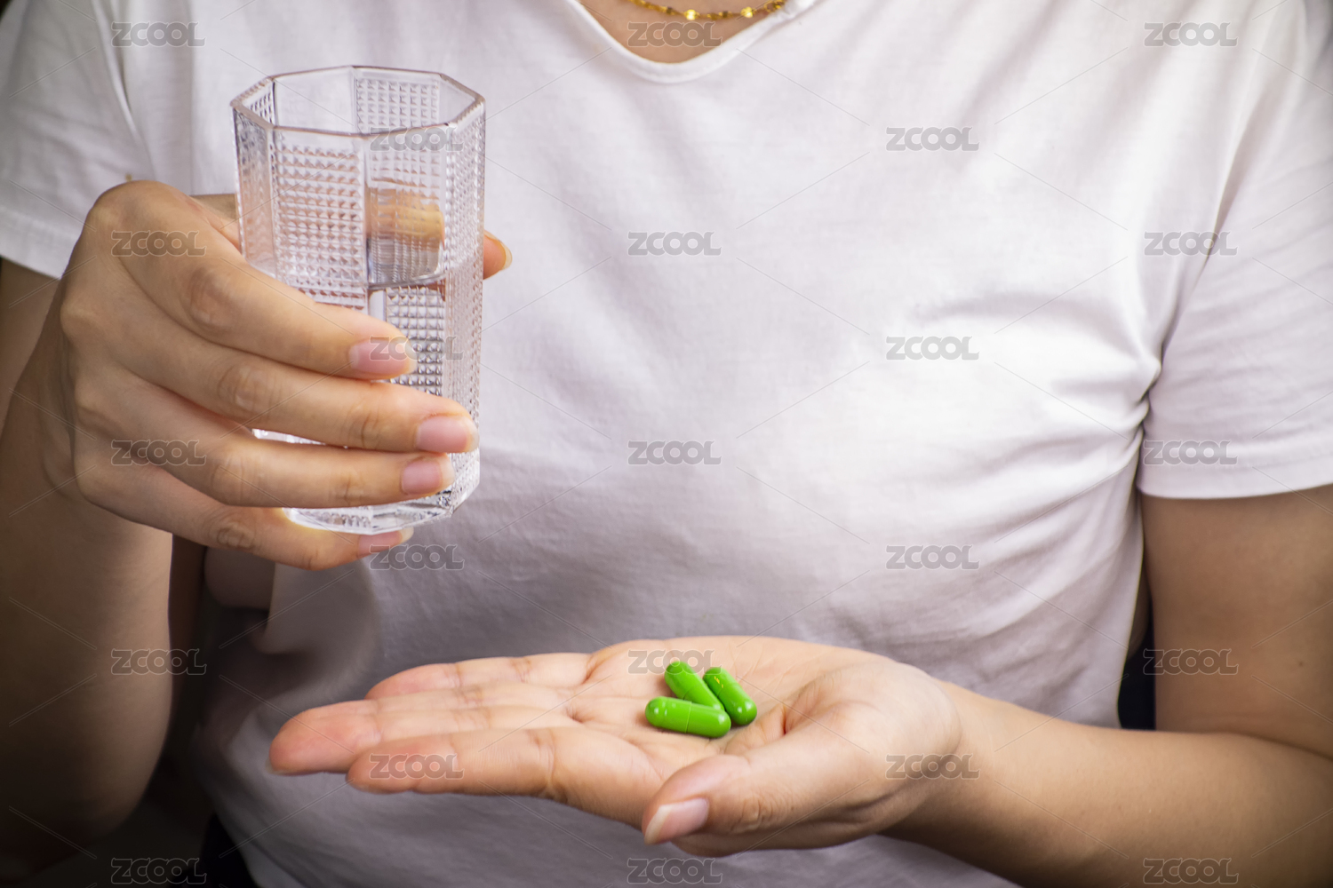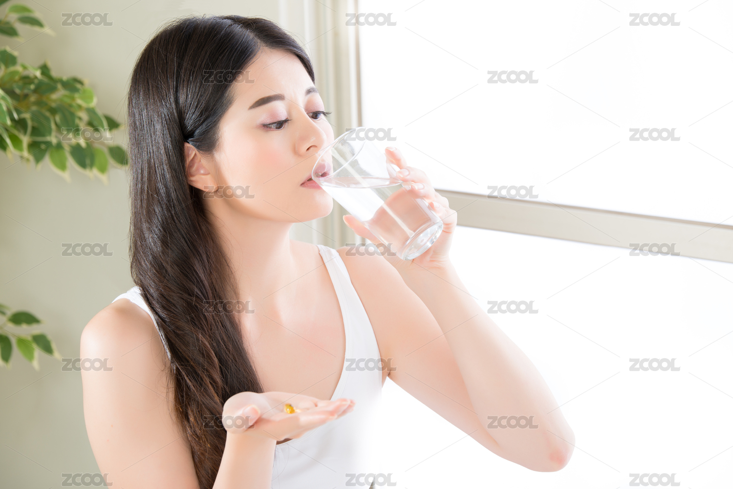 美丽的亚洲女性饮用水在家吃营养补充丸