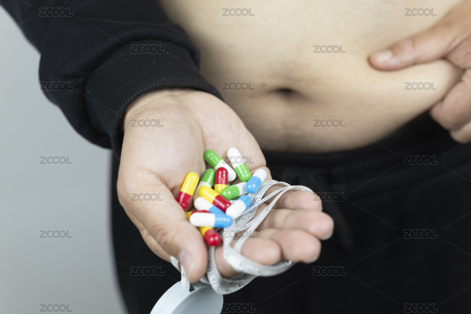想减肥的肥胖中国男人量腰围捏肚子脂肪赘肉