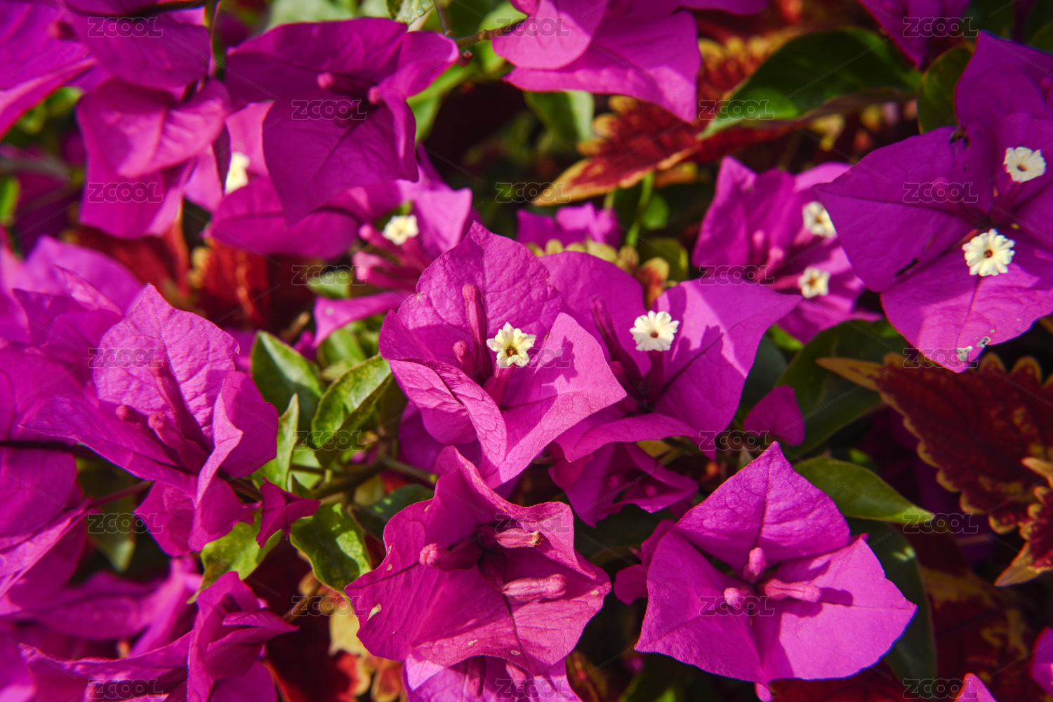 晴天户外阳光下的紫色簕杜鹃花蕊特写